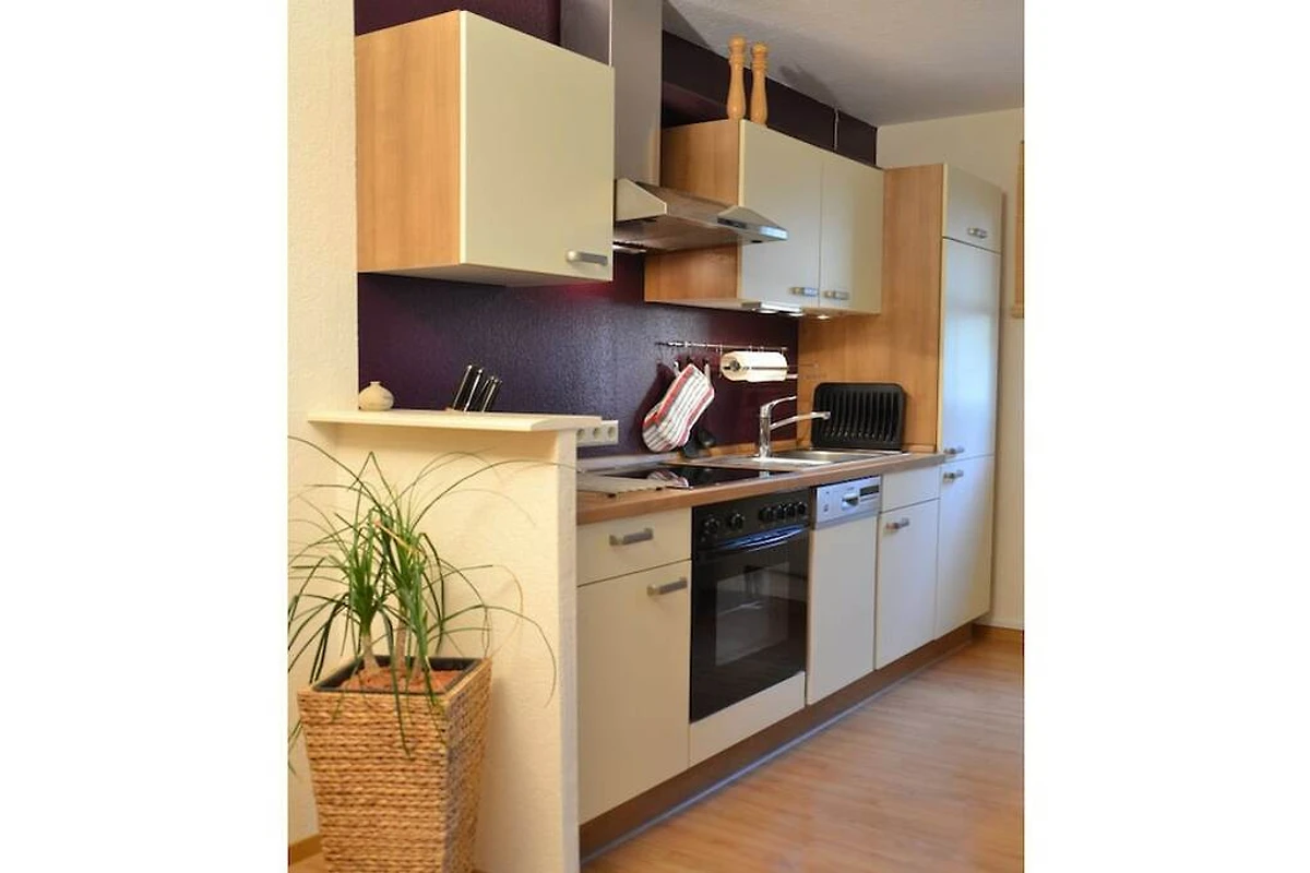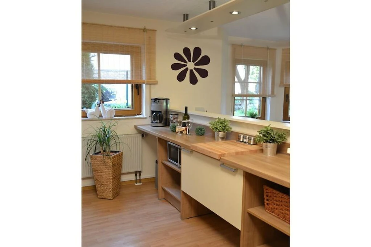 Das Apartment empfängt mit offenem Wohnraum, in dem Küche, Essplatz und Wohnzimmer stilvoll ineinander übergehen und direkten Zugang zur Terrasse und Garten bieten. Die Küche ist modern ausgestattet – mit Induktionsfeld, Backofen, Spülmaschine, Kühlschrank/Gefrierfach und allem was zum Kochen nötig ist. Die Kücheninsel mit Essplatz fügt sich dezent ins Wohnambiente ein. Im Schlafzimmer wartet ein Doppelbett und ein großer Schiebetürenschrank. Das neue, moderne Bad mit bodengleicher Dusche, Waschbecken aus Naturstein, Waschmaschine und Trockner sowie Holzböden in allen Räumen runden den Charakter des Apartments ab und schaffen eine gemütliche Atmosphäre. Zusätzlicher Komfort: WLAN, TV, eigener Eingang und geschützter Platz für Fahrräder.