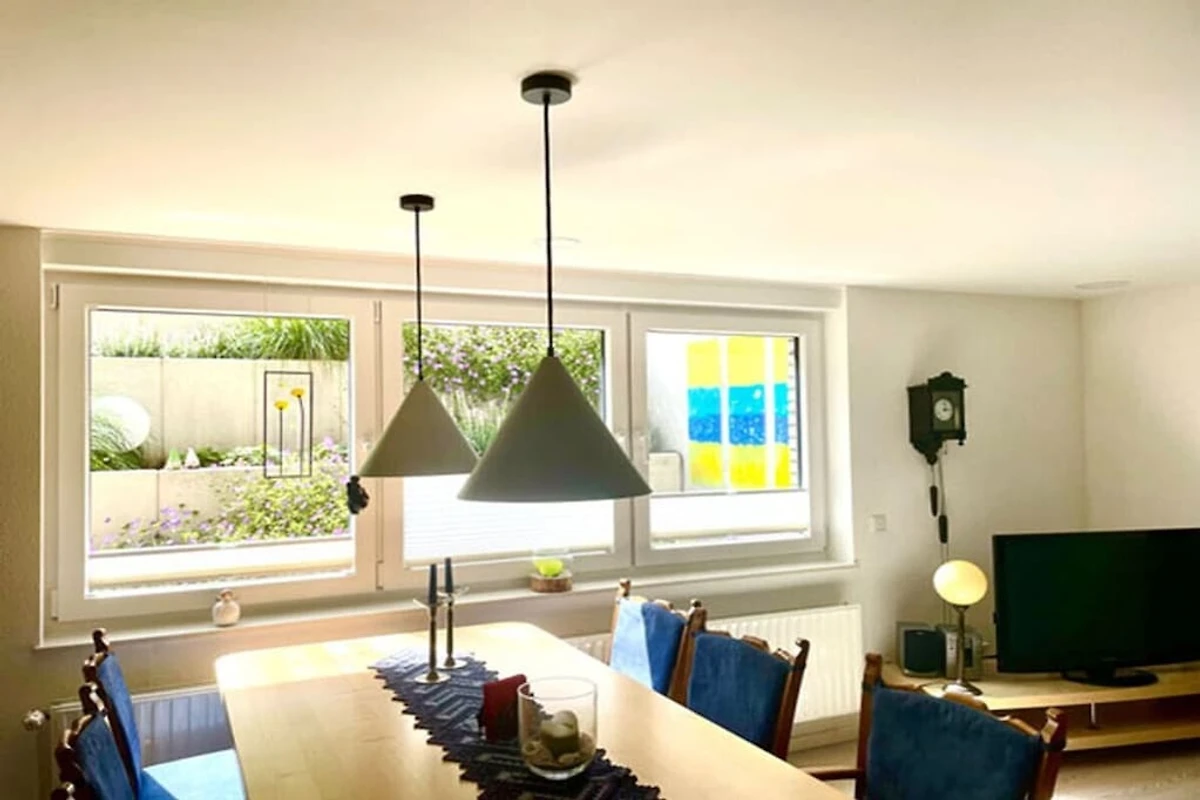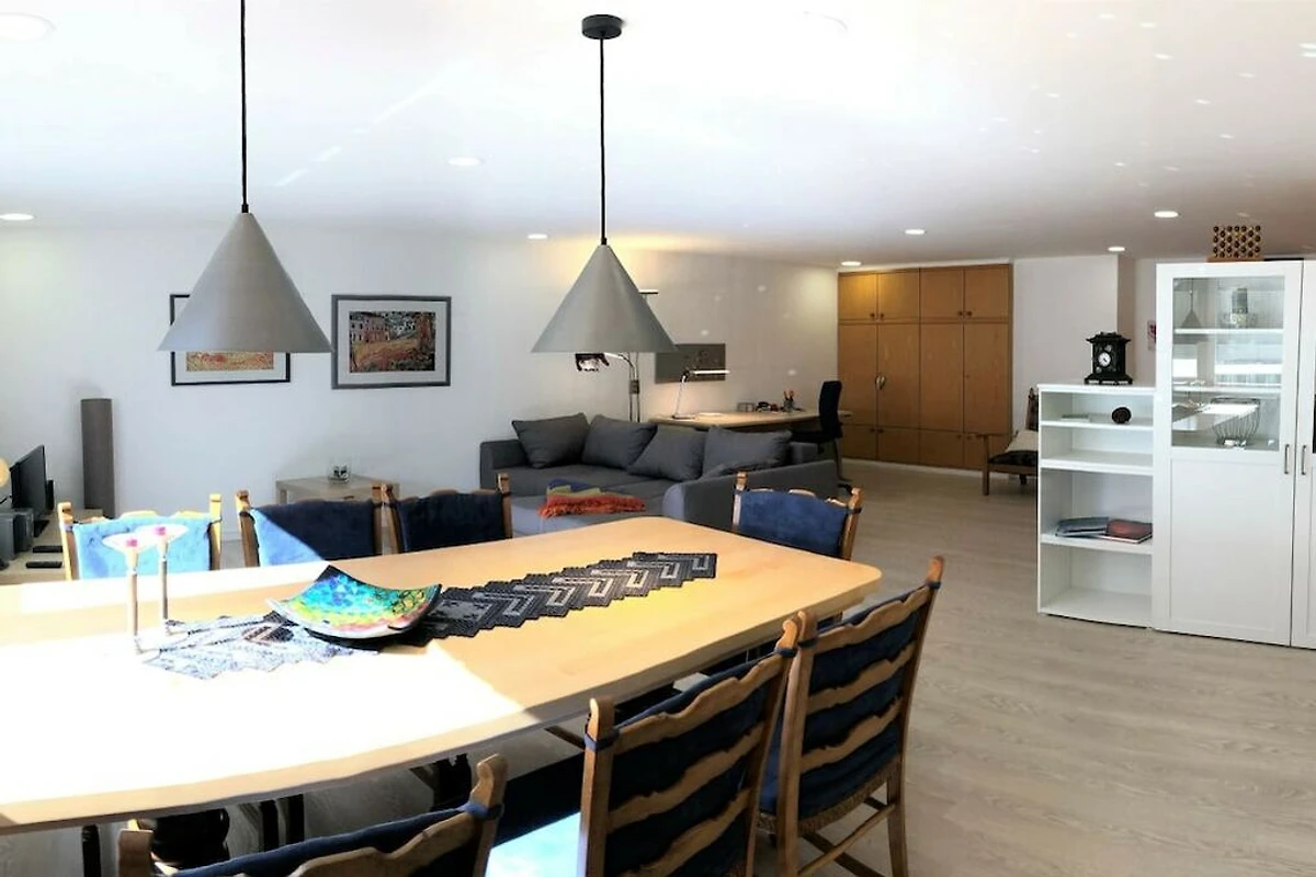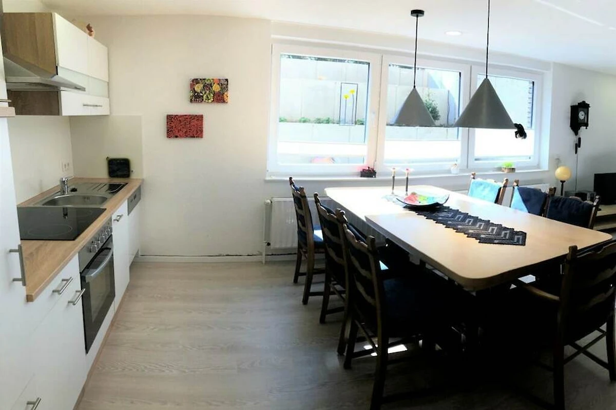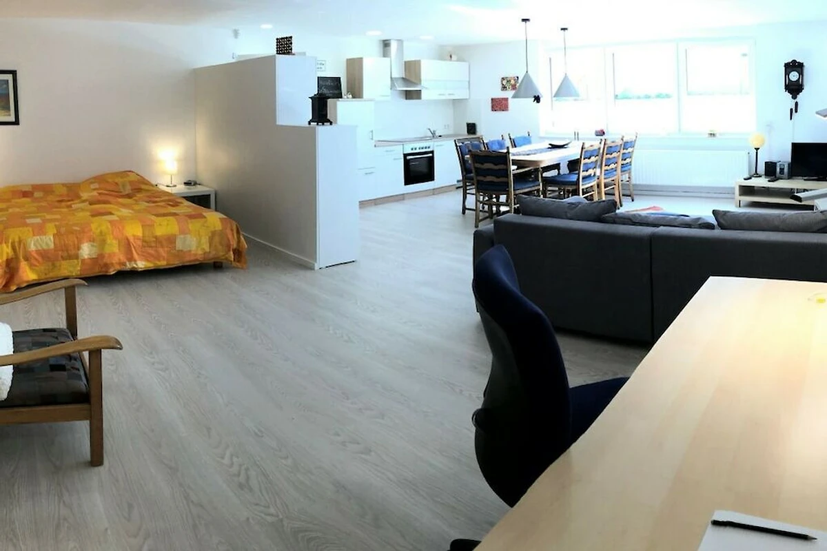 Geradeaus geht es dann in das 50 m² große Appartement. Direkt links liegt der Küchenbereich mit moderner Einbauküche mit 4-Platten-Ceran-Kochfeld, Backofen, Kühlschrank mit Gefrierfach & Kaffeemaschine. Falls Sie gerne kochen: eine reichliche Auswahl an Töpfen, Geschirr, Gläsern und Gewürzen ist hier selbstverständlich. Das Herzstück des Küchenbereichs ist der große massive Esstisch mit seinen sieben gemütlichen Stühlen. Hier können Sie sogar Gäste bewirten oder mal ein Meeting abhalten. Daran schließt sich der Wohnbereich an. Die große gemütliche Couch kann zu einem Bett ausgezogen werden. So können hier auch mehrere Personen getrennt schlafen. Ein Fernseher ist natürlich ebenfalls vorhanden.