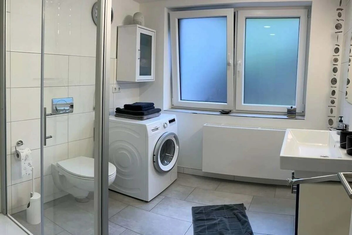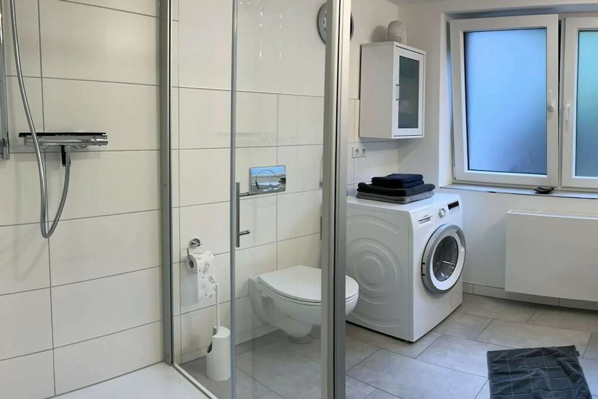 Vom kleinen Flur geht links das helle Tageslichtbad mit großer Dusche ab. Es steht Ihnen hier eine eigene Waschmaschine zur Verfügung. Und Duschgel, Shampoo, Handtücher, WC-Papier… hier ist alles schon für Ihren entspannten Aufenthalt vorbereitet.