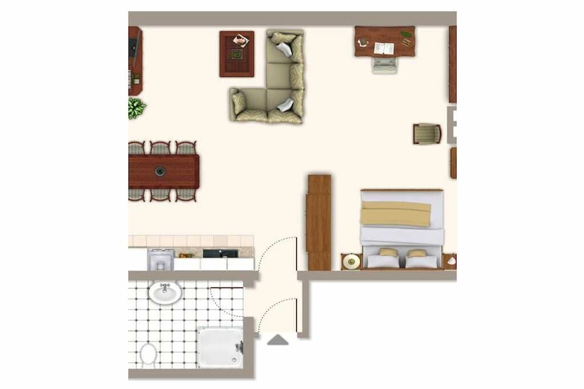 Der Schlafbereich ist optisch getrennt durch einen Raumteiler. Ein hochwertiges 1,80-Bett bietet besten Schlafkomfort. Und der große Einbau-Kleiderschrank hat Platz für Ihre Garderobe.
