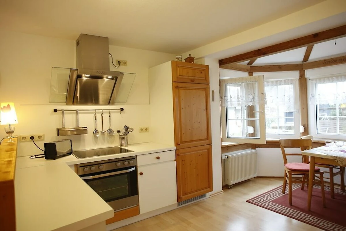 Einbauküche mit Spülmaschine, Mikrowelle, Backofen mit Ceranfeld, Kühlschrank, Toaster, Kaffee- und Espressomaschine, Geschirr für 4 Personen
