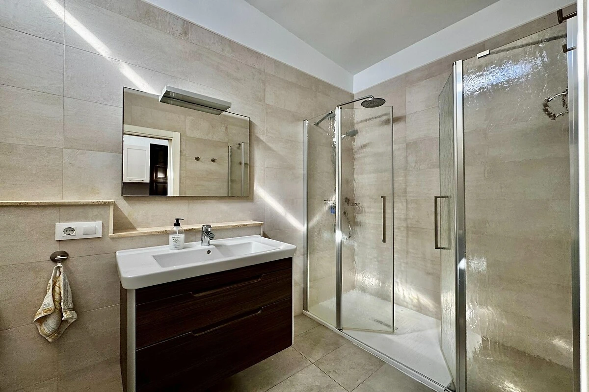 Die Wohnung verfügt über eine gut ausgestattete Küche mit Kochfeld, Dunstabzugshaube, Toaster, Kaffeemaschine und Geschirrspüler, so dass Sie mit Leichtigkeit köstliche Mahlzeiten zubereiten können. Das einladende Wohn-/Esszimmer verfügt über ein Doppelschlafsofa, einen Fernseher zur Unterhaltung, einen Esstisch und eine gemütliche Sitzecke, die alle auf einen schönen Balkon oder eine Terrasse führen, wo Sie Ihren Morgenkaffee oder den Sonnenuntergang genießen können. Ziehen Sie sich in die komfortablen Schlafzimmer zurück, die für einen erholsamen Schlaf ausgelegt sind und über gepflegte Bäder mit allen notwendigen Annehmlichkeiten verfügen. Sie werden auch die Klimaanlage und die Heizung zu schätzen wissen, die das ganze Jahr über für eine angenehme Atmosphäre sorgen.