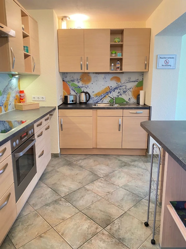 Die voll ausgestattete Küche mit Geschirrspüler, Mikrowelle, Wasserkocher, Kaffeemaschine und weiteren modernen Geräten macht die Selbstversorgung einfach. Ein gemütlicher Wohnbereich mit Fernseher und bequemen Sitzmöglichkeiten lädt zum Verweilen ein. Kostenloses WLAN ist in der gesamten Wohnung verfügbar, ideal für Gäste, die auch im Urlaub vernetzt bleiben möchten.
