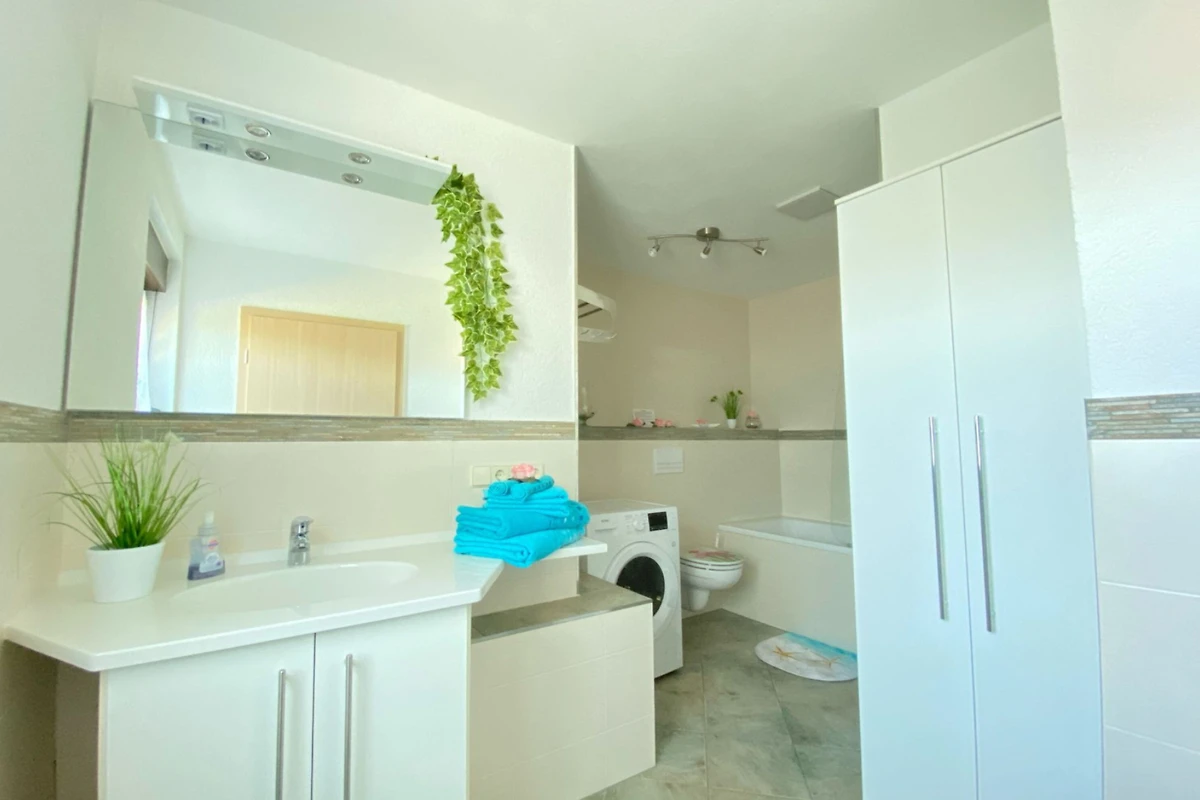Für Familien mit kleinen Kindern stehen ein Kinderbett und ein Hochstuhl bereit. Auch Langzeitmieten bis zu 6 Monaten sind möglich, was die Wohnung besonders für Geschäftsreisende oder Monteure attraktiv macht. Ein Parkplatz direkt vor der Tür, eine Waschmaschine und ein Trockner bieten zusätzlichen Komfort.