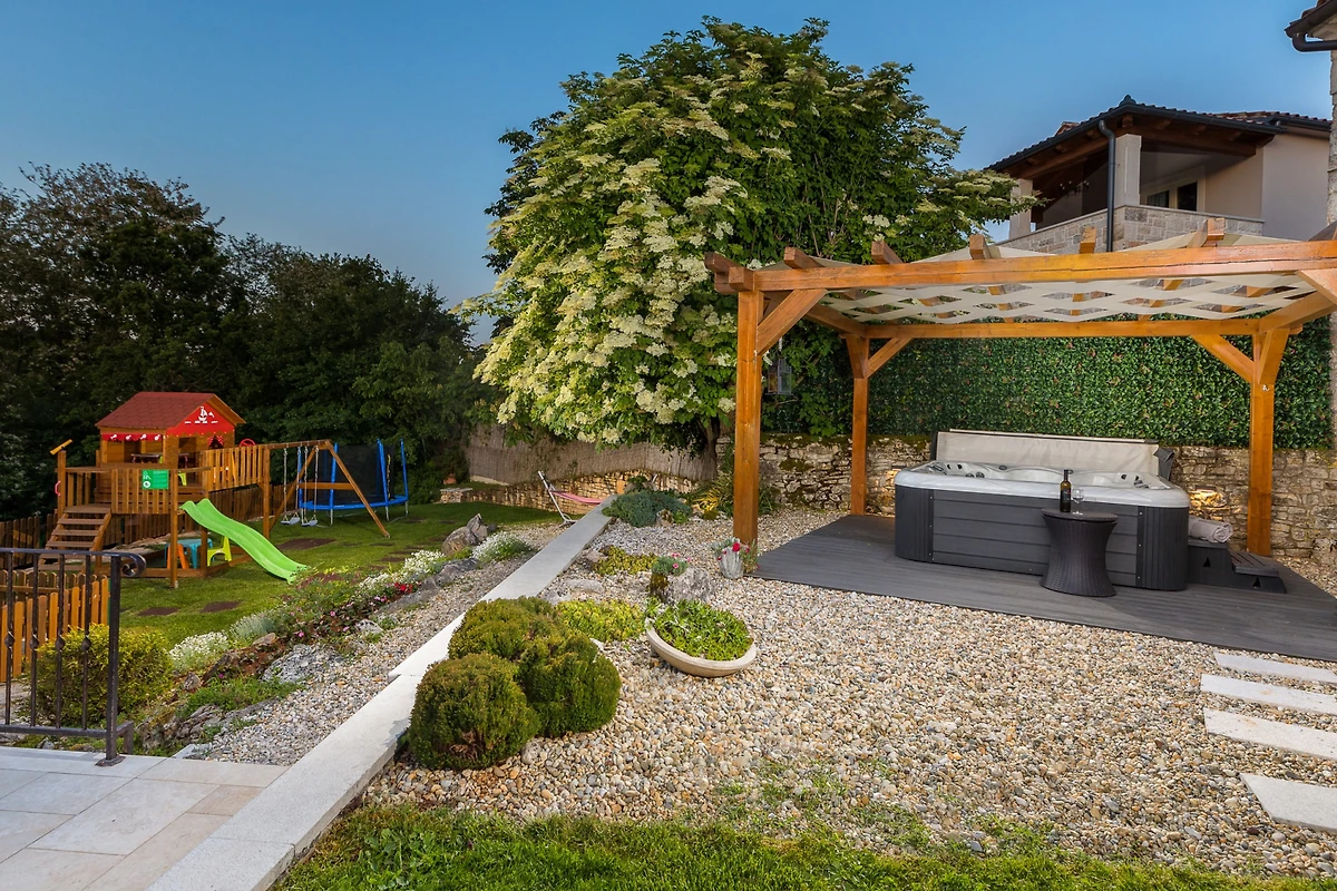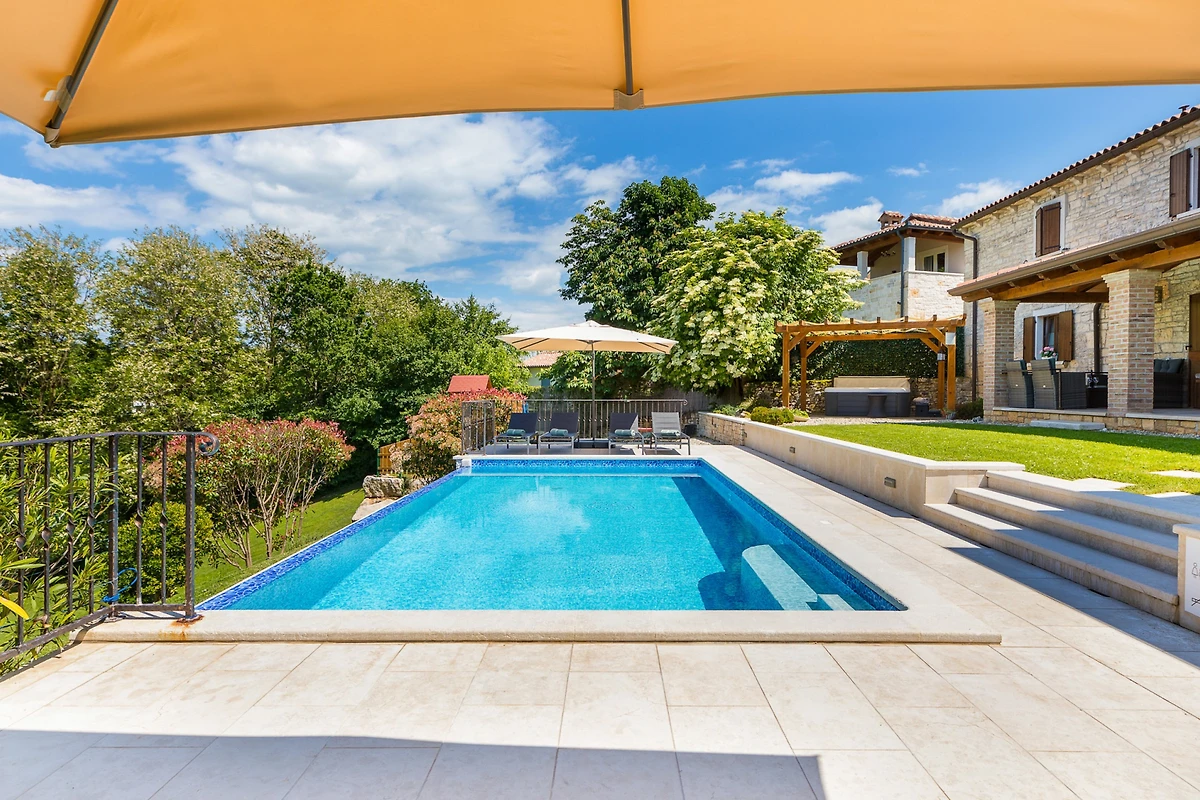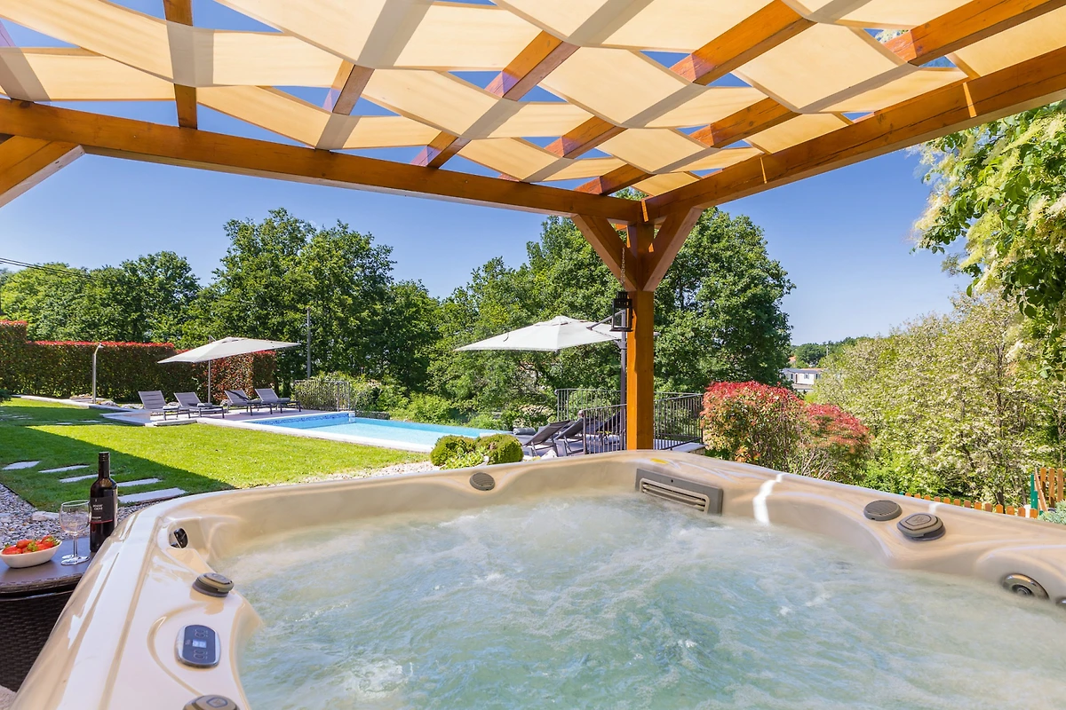 Naturliebhaber werden das grosszügige 3000 Quadratmeter grosse Grundstück lieben, das einen privaten Garten, Gartenmöbel, einen Grillbereich und ein eingezäuntes Areal für zusätzliche Sicherheit bietet. Der Höhepunkt der Immobilie ist der private Swimmingpool mit einer Grösse von 8x4 Metern, perfekt für erfrischende Schwimmen und Familienunterhaltung. Zusätzlich können Gäste nach einem Tag der Erkundung im luxuriösen Spa und Whirlpool entspannen.