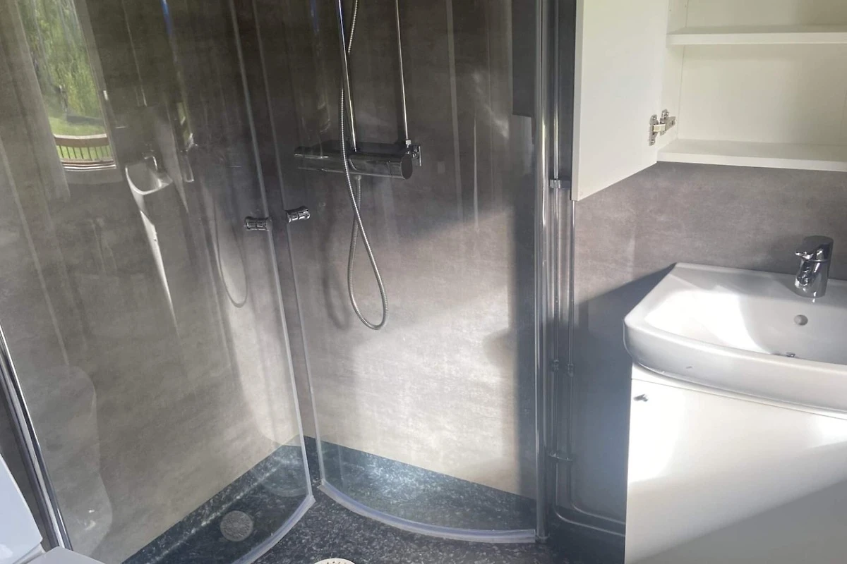 Küche(Kochherd(elektrisch), Kaffeemaschine, Kühlschrank(+ Gefrierfach)), Wohn-/Schlafzimmer(TV(schwedische Fernsehsender), Kaminofen), Schlafzimmer(2x Einzelbett), Schlafzimmer(2x Etagenbett), Badezimmer(Waschbecken, Dusche, Toilette), Heizung(elektrisch), Terrasse, Gartenmöbel