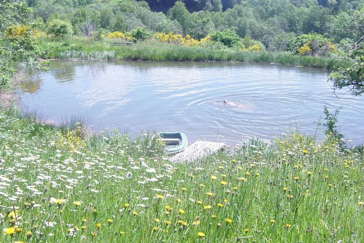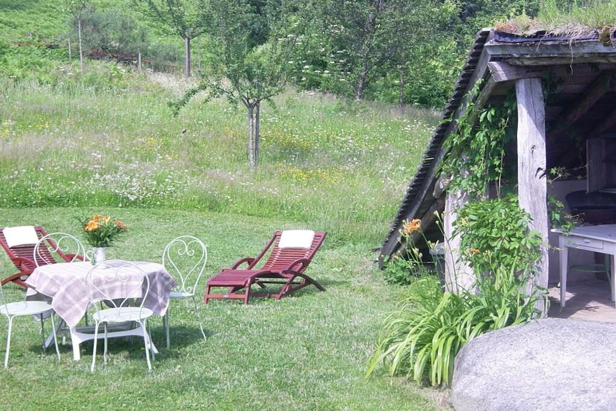 Wunderschön gelegene im Biobau restauriertes typisches Bauernhaus. Auf einem kleinen Hügel, Südlage, über ein paar Forellen-Weihern gelegen. Das Wasser kommt von der Quelle, frisch und klar, die Luft ist rein (700 m), Mauern sind aus Stein, Böden aus Holz. Ideal für Familienferien voll Natur. Ausstattung ist mit sehr viel Sorgfalt gemacht worden, Bücher, offenes Feuer, 3 ha Garten, privater Weiher, Sternenhimmel... Das ist Leben!