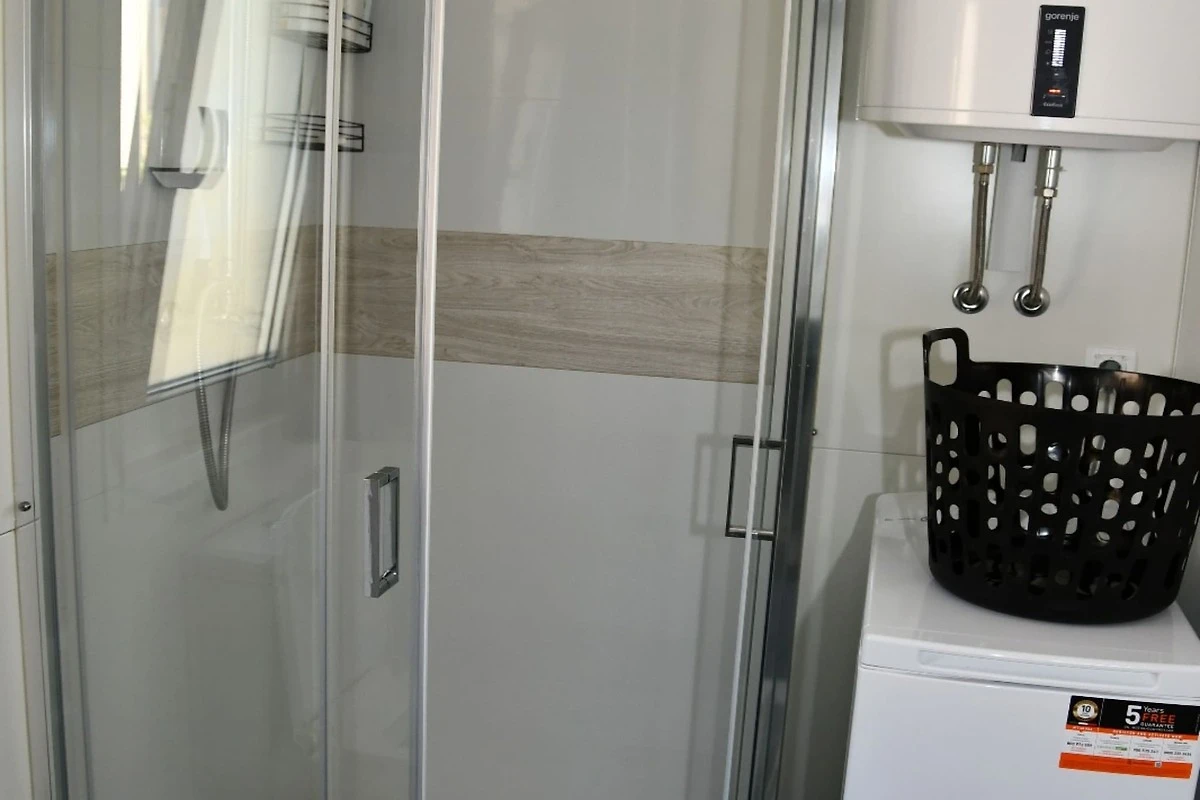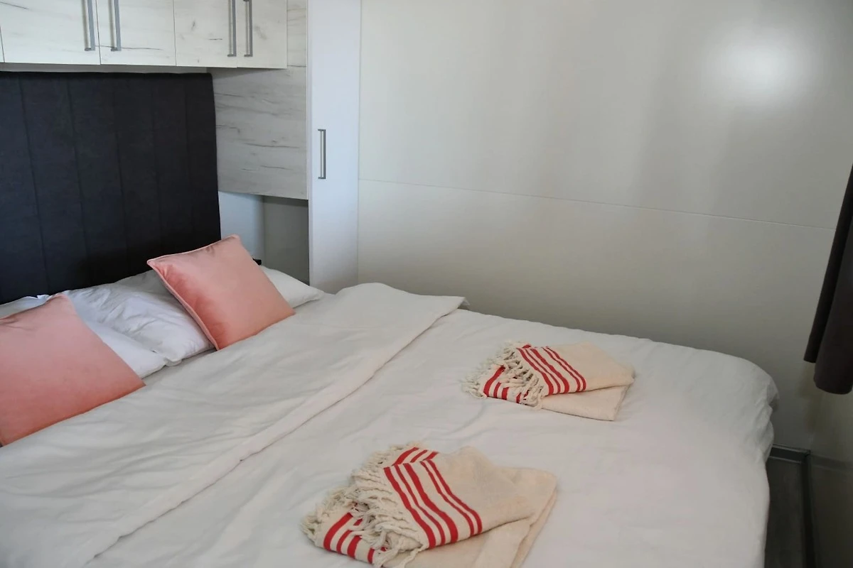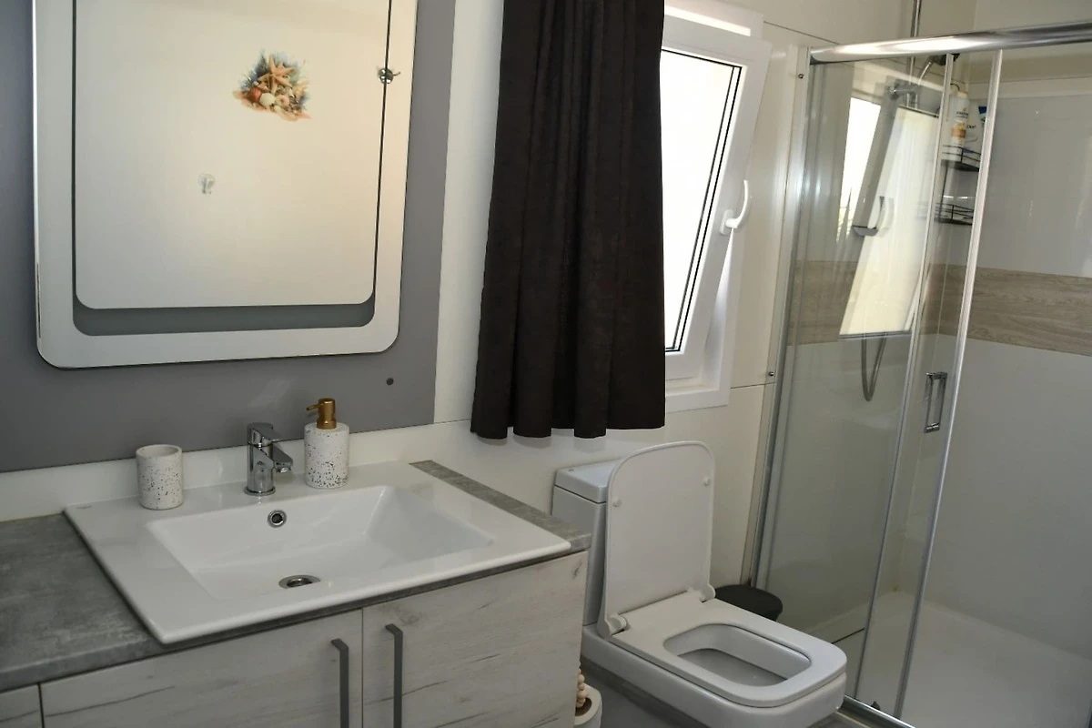This mobile home with terrace and sea view (Azzuro) is fitted with 2 bedrooms which includes double bed / single bed and with living room as well as private bathroom with toilet and shower.