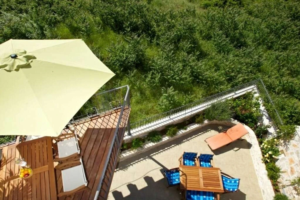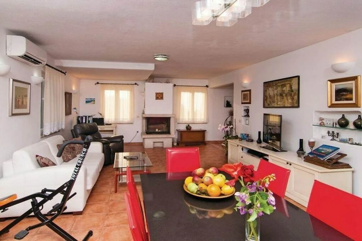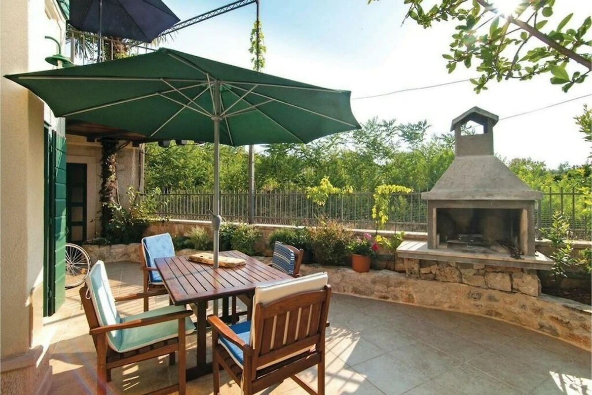 Das Wohnzimmer ist durch Fenstertüren von einer wunderschön angelegten Terrasse mit Gartenmöbeln getrennt, ein perfekter Ort, um einen Morgenkaffee im Schatten zu trinken. In diesem Bereich gibt es einen Außengrill, auf dem Sie verschiedene dalmatinische Spezialitäten zubereiten können. Hier ist die Sauna für 2-3 Personen. In der Nähe des Eingangs zur Sauna befinden sich 2 Duschen, von denen eine als Wasserfall gestaltet ist. Hier ist eine weitere Terrasse mit Gartenmöbeln.