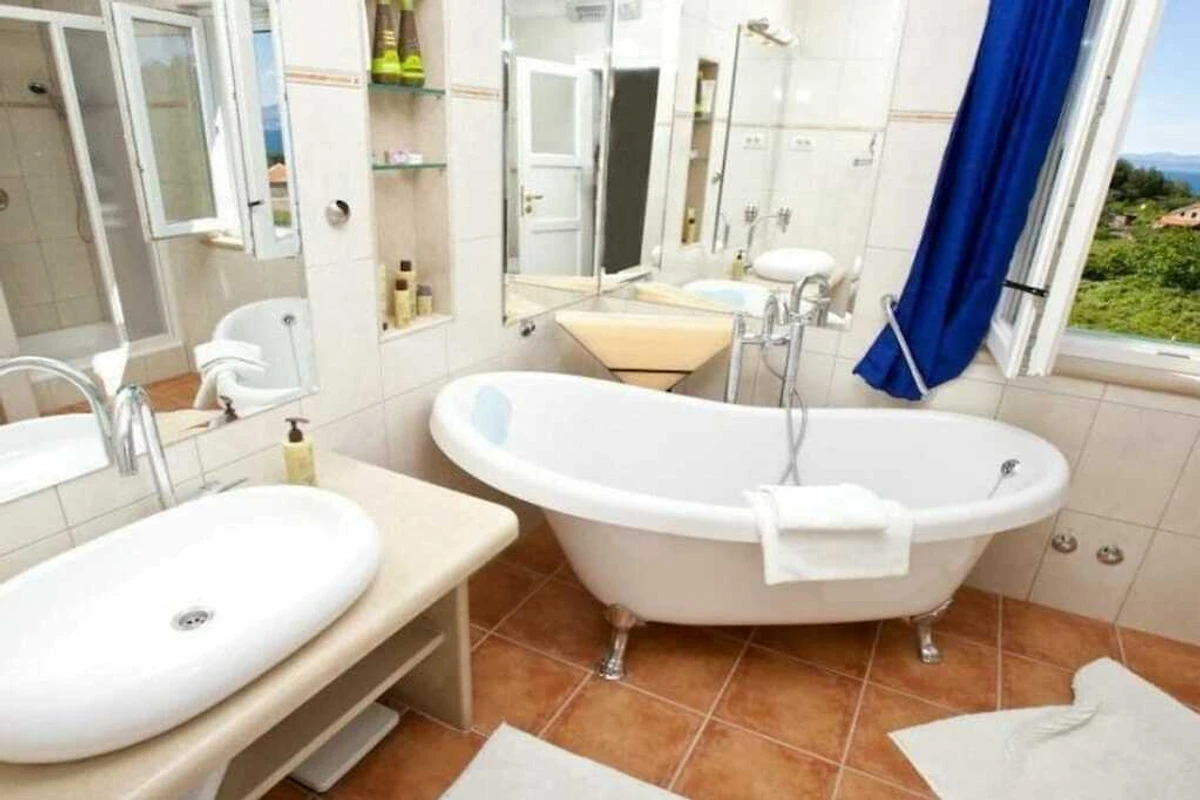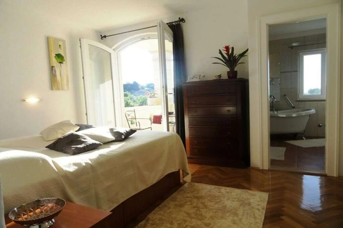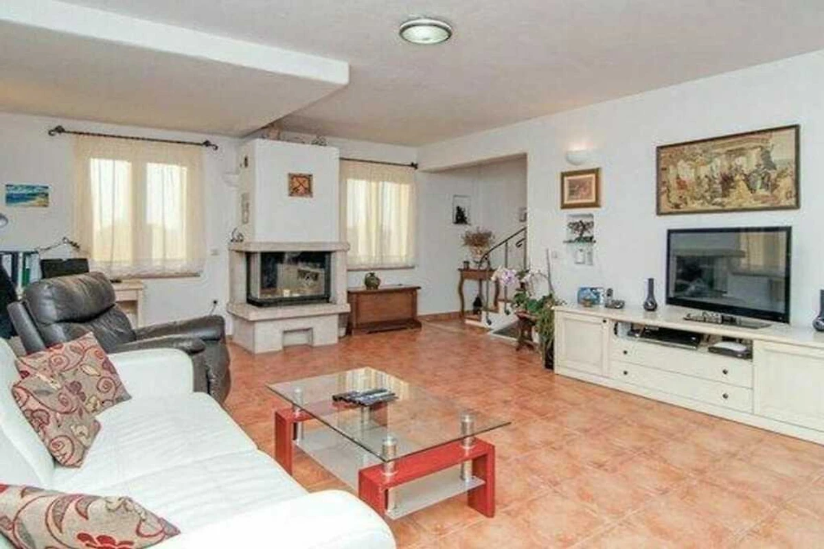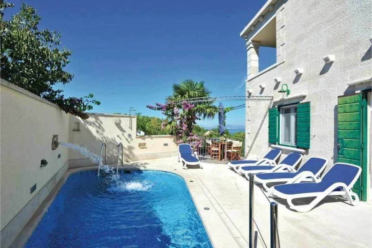 Das Wohnzimmer ist durch Fenstertüren von einer wunderschön angelegten Terrasse mit Gartenmöbeln getrennt, ein perfekter Ort, um einen Morgenkaffee im Schatten zu trinken. In diesem Bereich gibt es einen Außengrill, auf dem Sie verschiedene dalmatinische Spezialitäten zubereiten können. Hier ist die Sauna für 2-3 Personen. In der Nähe des Eingangs zur Sauna befinden sich 2 Duschen, von denen eine als Wasserfall gestaltet ist. Hier ist eine weitere Terrasse mit Gartenmöbeln.