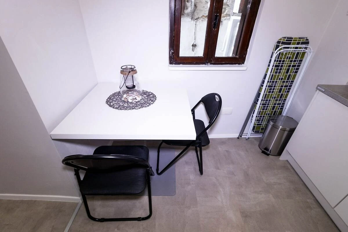 Studio for 3 is located on the first floor, accessible by elevator and stairs. In the living room, there is a double bed with a pull out single bed. The kitchen is equipped with stove, microwave, coffee maker, kitchen utensils, toaster, dinning table. The bathroom has a shower, toilet, hair dryer, toilet paper and towels.