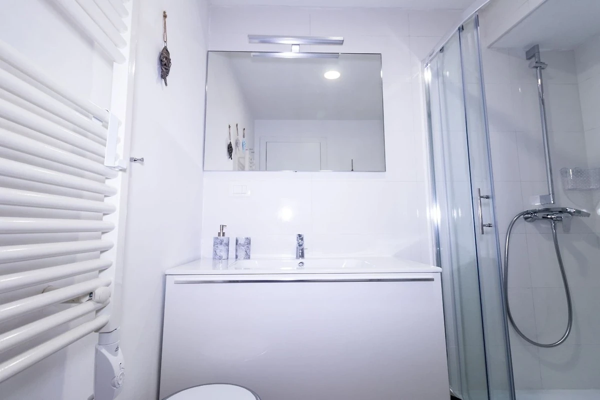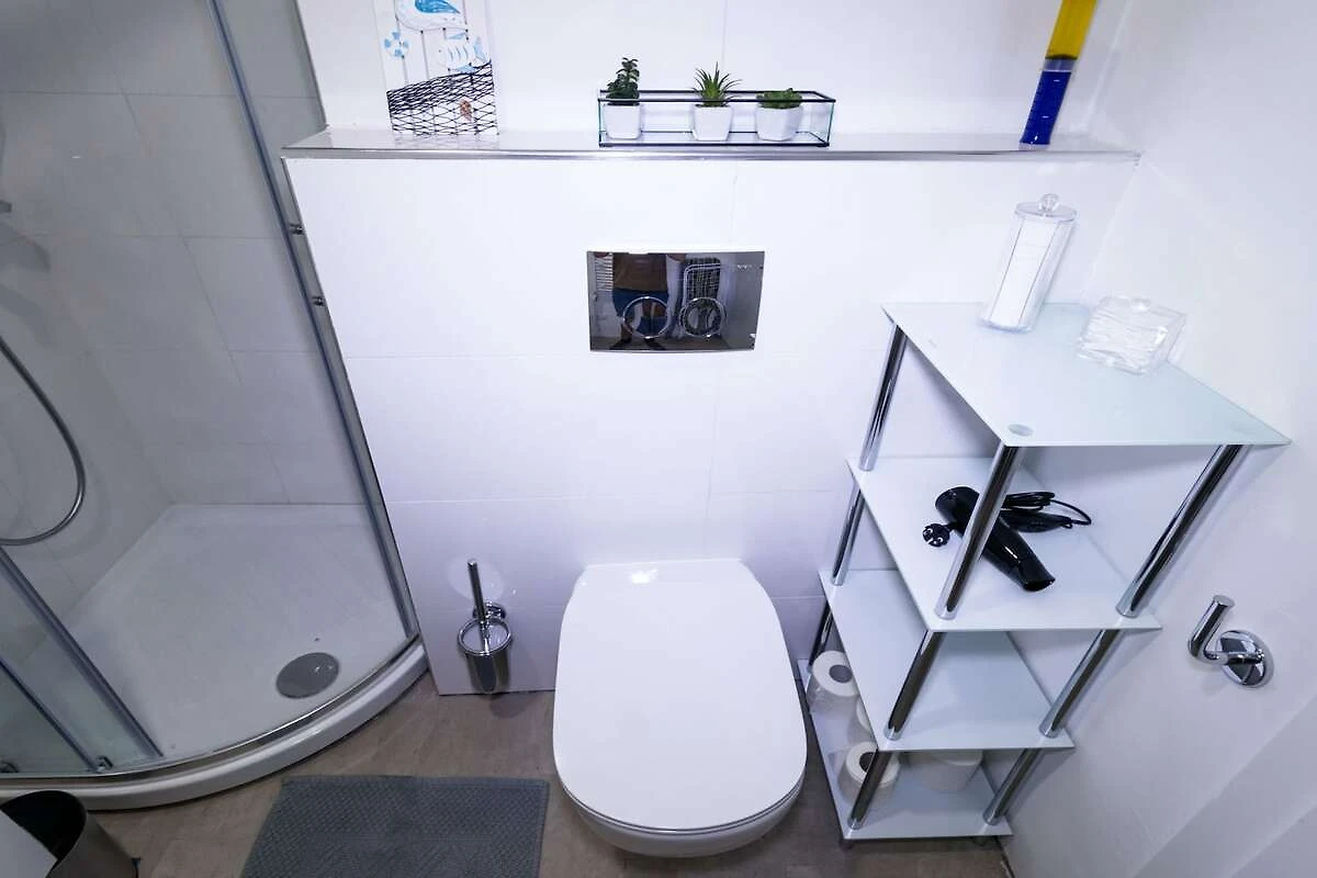 Studio with terrace for 3 is located on the first floor, accessible by elevator and stairs. In the living room, there is a double bed with a pull out single bed. The kitchen is equipped with stove, microwave, coffee maker, kitchen utensils, toaster, dinning table. The bathroom has a shower, toilet, hair dryer, toilet paper and towels.