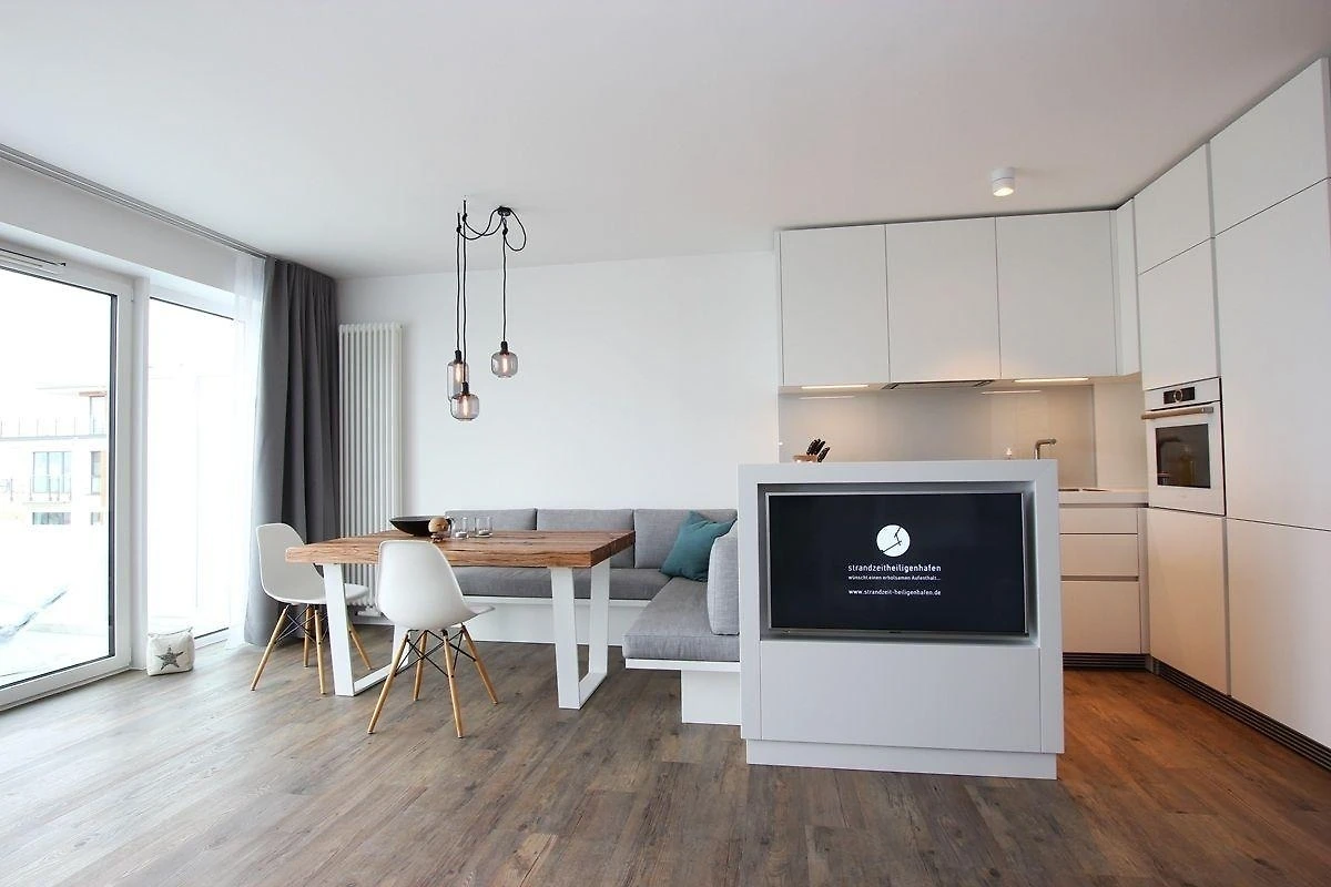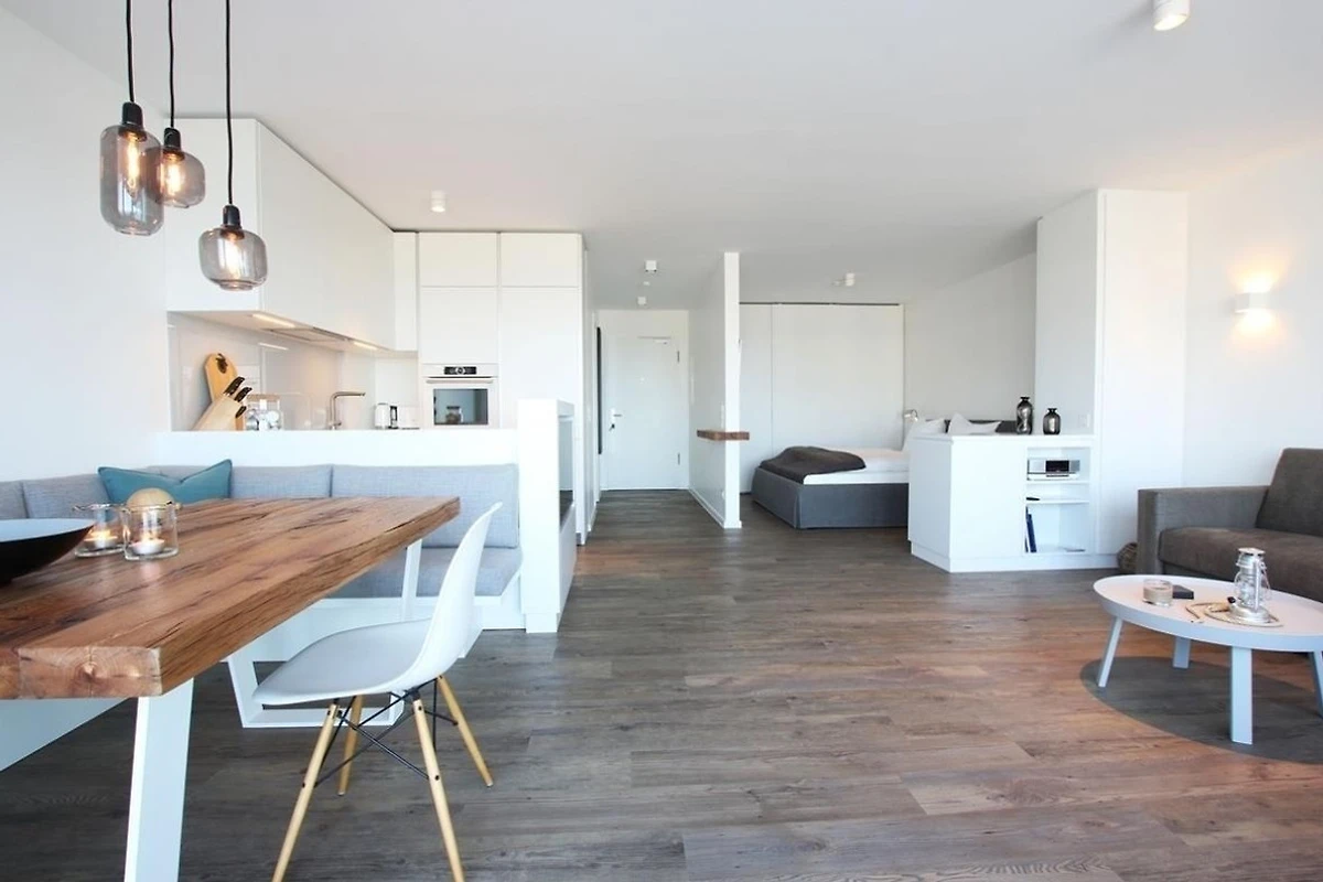 Die Ferienwohnung liegt in der 3ten Etage und ist mit dem Aufzug bequem zu erreichen. Sie verfügt über einen grossen, offenen Wohn-/Schlafbereich mit rund 50 m², ein geräumiges Bad mit Rainshowerdusche, Fussbodenheizung, vielen Ablagemöglichkeiten und Föhn sowie einen ca. 18 m² grossen Balkon mit einem atemberaubenden Ausblick auf die Ostsee.