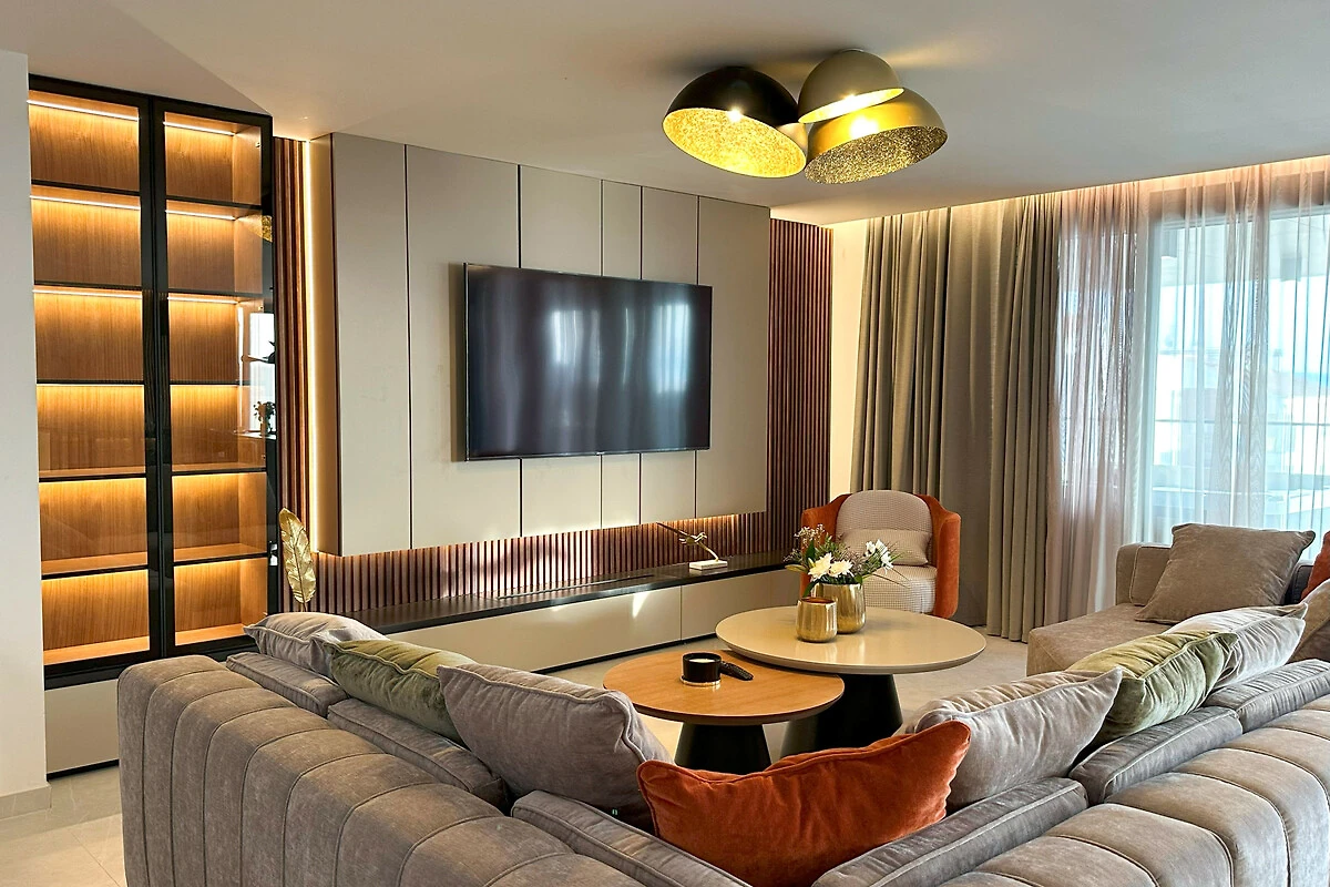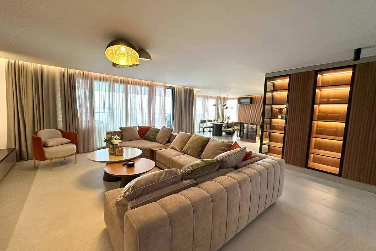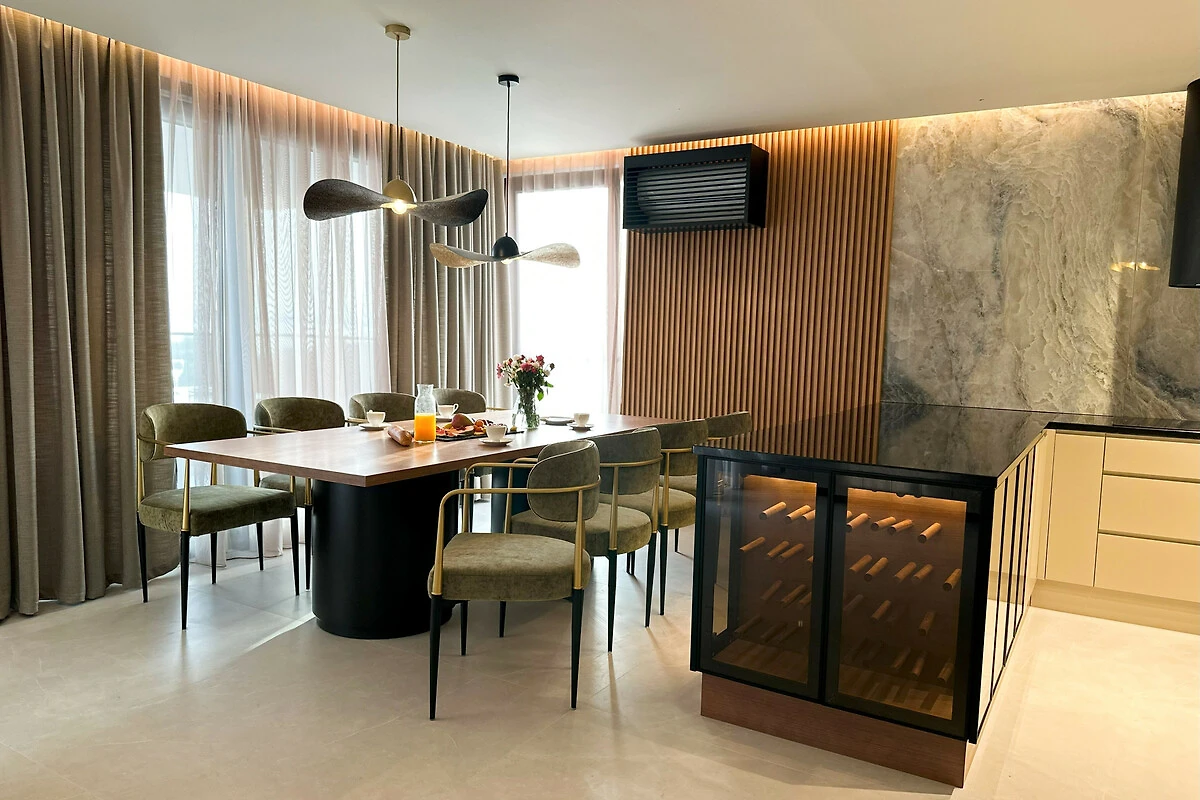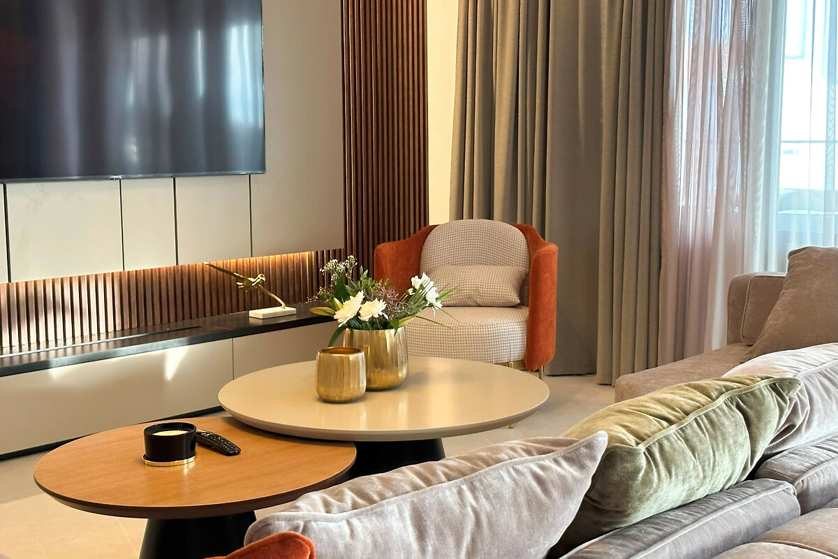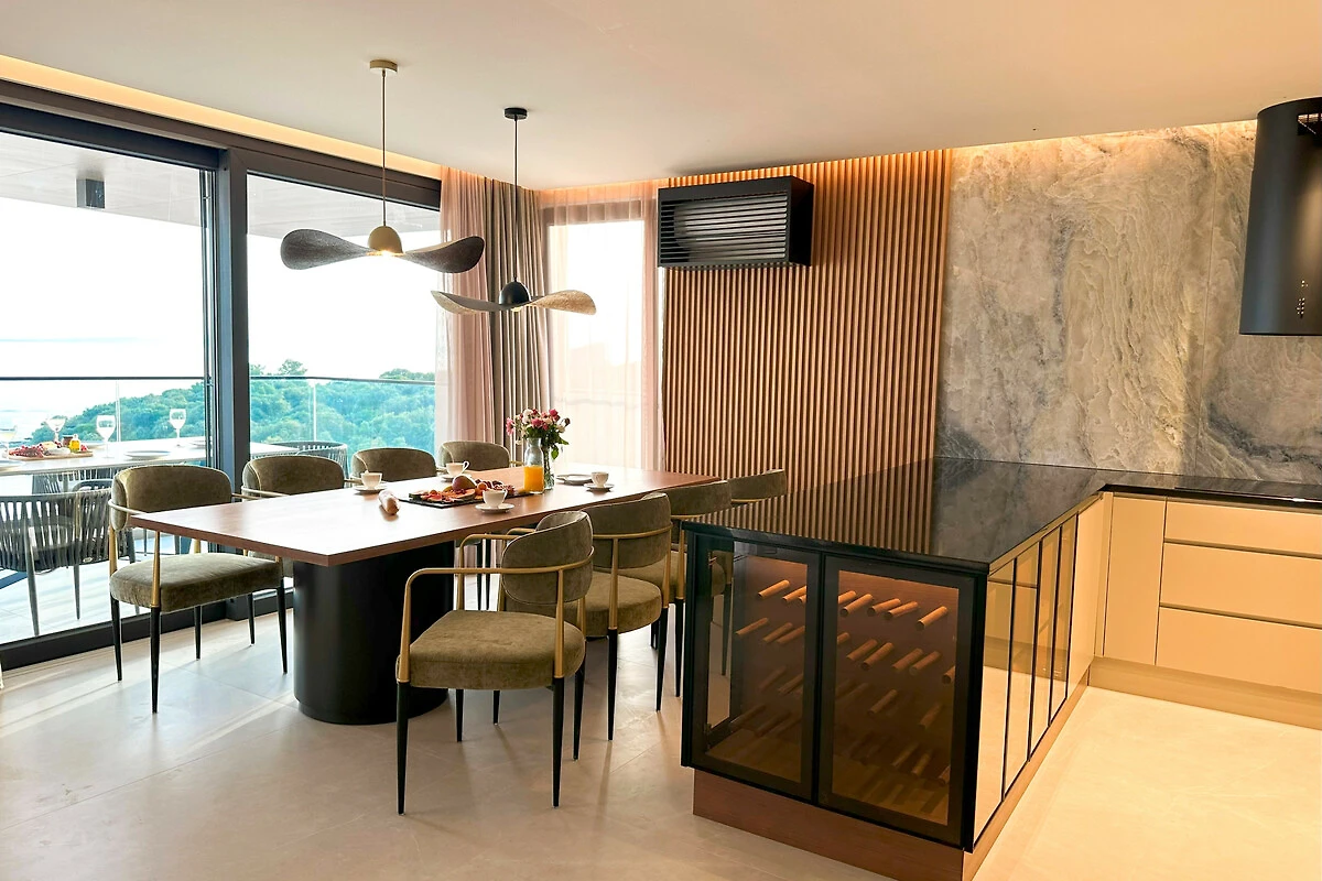 Die Wohnung verfügt über einen atemberaubenden möblierten Balkon mit herrlichem Meerblick, der den perfekten Ort bietet, um Morgenkaffee oder Abendcocktails zu geniessen. Mit drei Schlafzimmern in Kingsize-Grösse und einem Doppelschlafsofa bietet der Raum flexible Schlafmöglichkeiten für alle Gäste. Das Interieur zeichnet sich durch elegante Marmorböden und eine voll ausgestattete amerikanische Küche mit modernen Geräten aus, darunter ein Induktionsherd, Geschirrspüler und Kaffeemaschine.