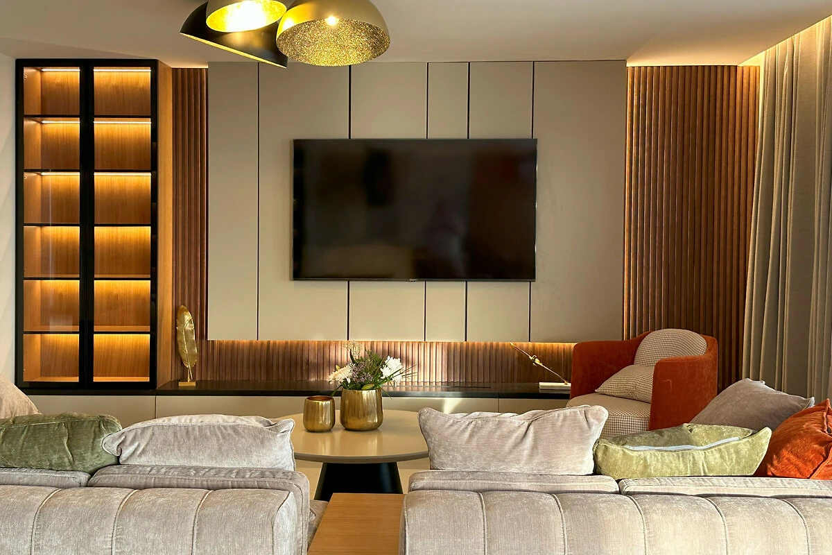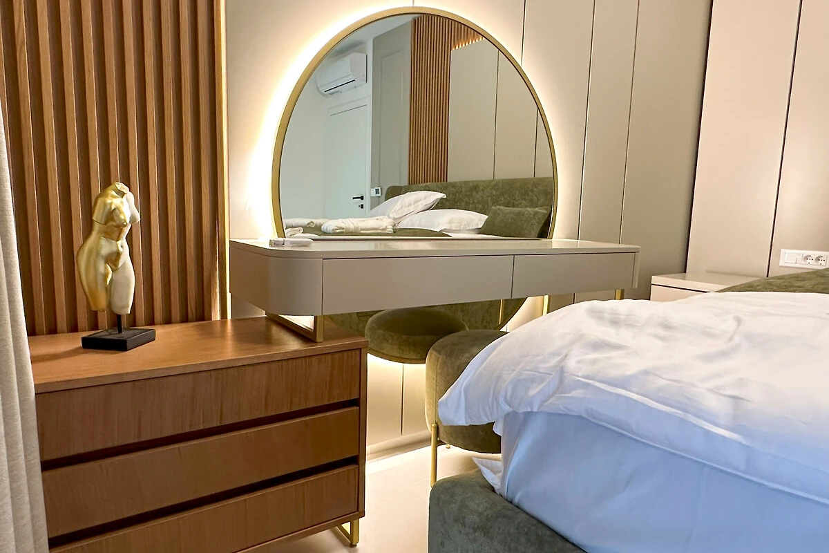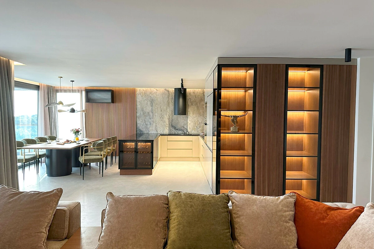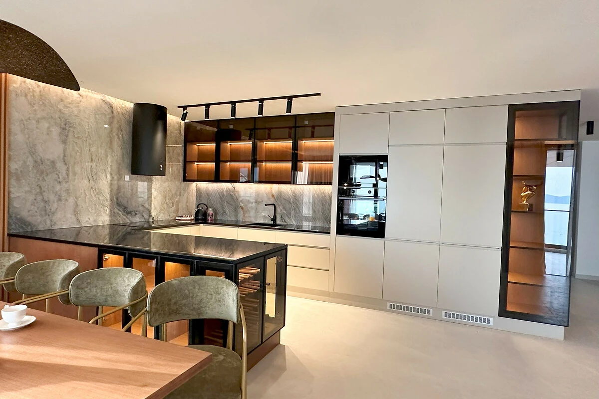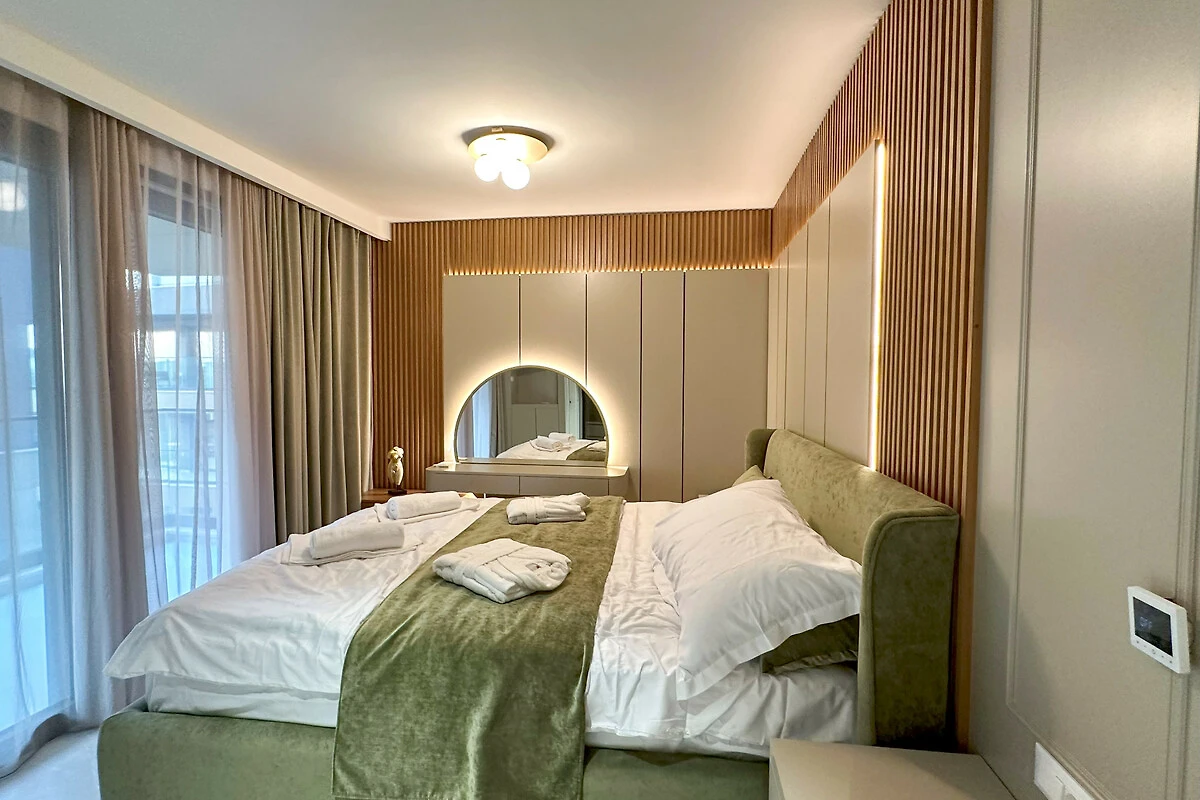 Die Wohnung verfügt über einen atemberaubenden möblierten Balkon mit herrlichem Meerblick, der den perfekten Ort bietet, um Morgenkaffee oder Abendcocktails zu geniessen. Mit drei Schlafzimmern in Kingsize-Grösse und einem Doppelschlafsofa bietet der Raum flexible Schlafmöglichkeiten für alle Gäste. Das Interieur zeichnet sich durch elegante Marmorböden und eine voll ausgestattete amerikanische Küche mit modernen Geräten aus, darunter ein Induktionsherd, Geschirrspüler und Kaffeemaschine.