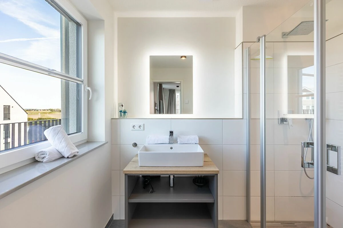 Ein besonderes Highlight ist die großzügige Dachterrasse mit bequemen Gartenmöbeln. Hier können Sie entspannen, die frische Nordseeluft genießen und den unverbauten Blick auf das Meer schweifen lassen. Die gesamte Wohnung ist mit einer Fußbodenheizung (Erdwärme) ausgestattet, sodass Sie sich auch in den kühleren Monaten rundum wohlfühlen. Alle Fenster sind zudem mit Sichtschutz versehen.