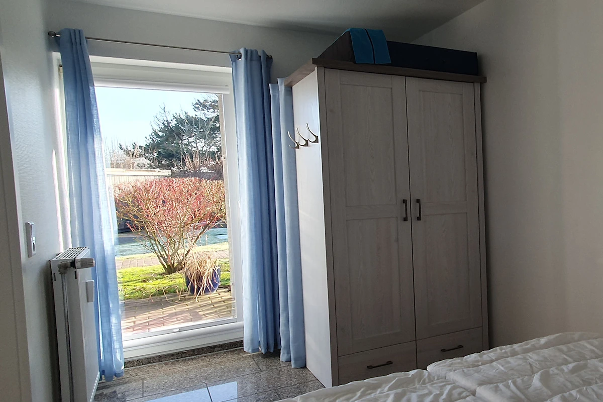 Das Schlafzimmer hat Zugang zur Terrasse. Das vorhandene Rollo kann den Raum komplett abdunkeln. Das neue Massivholzbett 160x200cm ist sehr komfortabel und stabil. Die Matratzen sind neu und die Nachttischkonsolen aus Massivholz bieten je eine Nachttischlampe. Für das Handy oder das Tablet sind Ladeanschlüsse USB A + C am Bett vorhanden. Ein Kinderreisebett (kostenlos) und ein Schrank sind ebenfalls vorhanden. Erholsame Nächte in ruhiger Umgebung garantieren eine entspannte Auszeit. Bettwäsche kann gebucht werden (Wäschepaket).