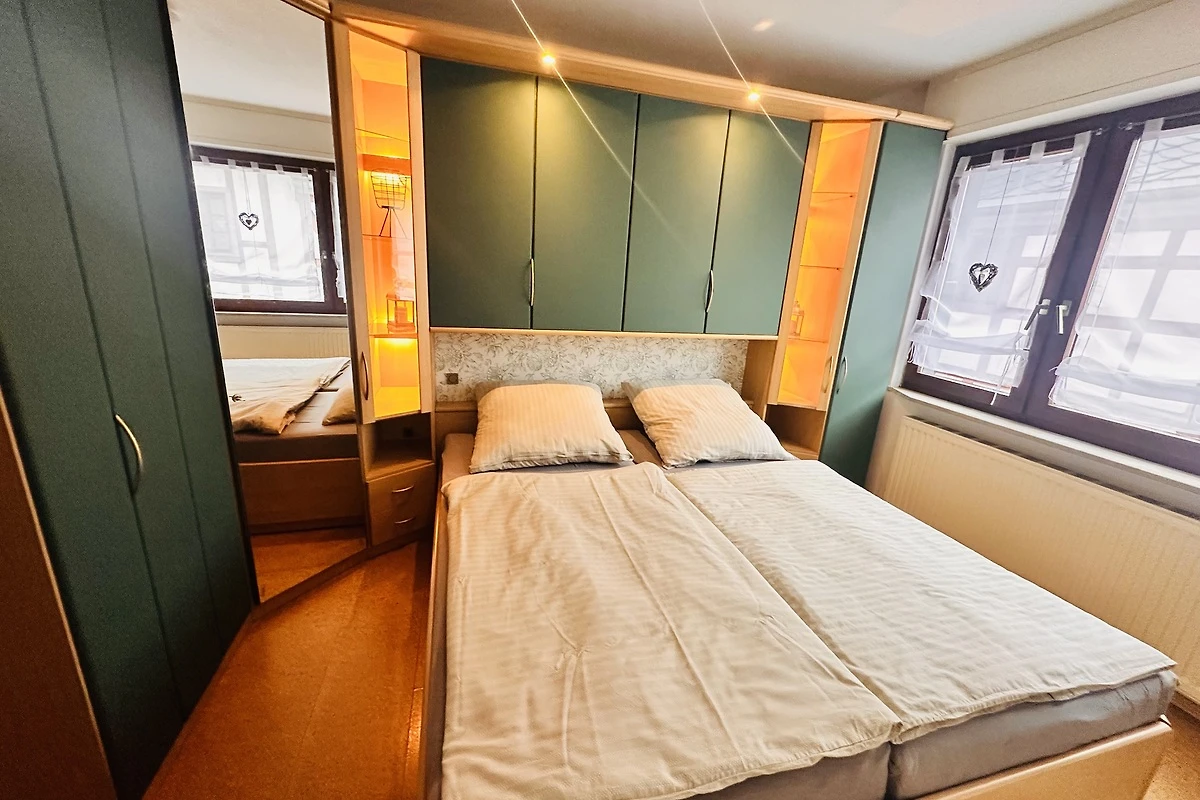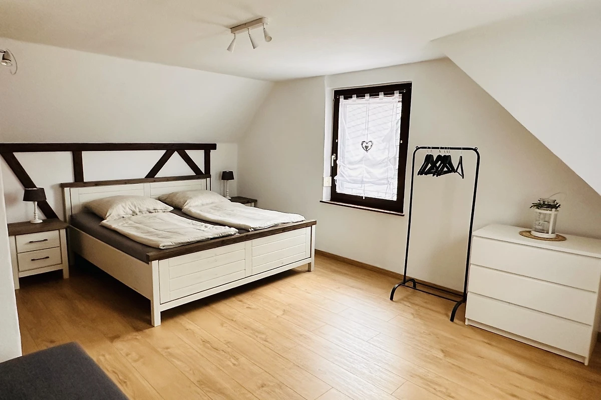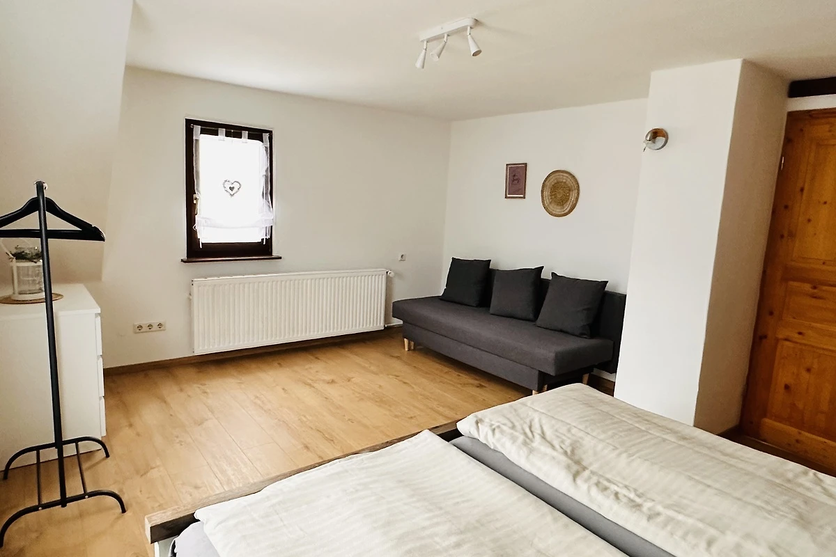 Schlafzimmer mit Doppelbett (hochwertige Matratzen) und zusätzlichem Schlafsofa (auf Anfrage für 1–2 Personen)