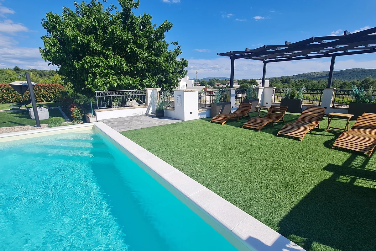 Entdecken Sie die perfekte Unterkunft in der Whitestone Villa, einer atemberaubenden modernen Immobilie, die in der wunderschönen ländlichen Landschaft in der Nähe von Šibenik eingebettet ist. Diese geräumige Villa bietet bequem Platz für bis zu 7 Gäste und ist ideal für Familien oder Freundesgruppen, die einen unvergesslichen kroatischen Urlaub suchen.