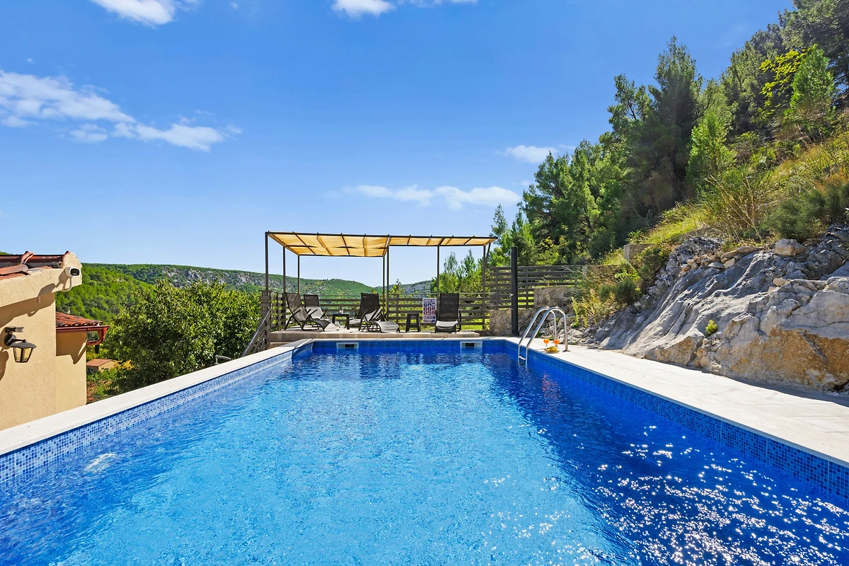 Geniessen Sie den privaten beheizten Swimmingpool der Villa mit einer Grösse von 8x4 Metern, ideal für entspannte Sommertage. Das grosszügige 650 Quadratmeter grosse Grundstück umfasst einen wunderschönen Garten mit Grillbereich, perfekt für Outdoor-Dining und Familienzusammenkünfte. Berg-, Pool- und Gartenblicke bieten eine malerische Kulisse für Ihren Aufenthalt.