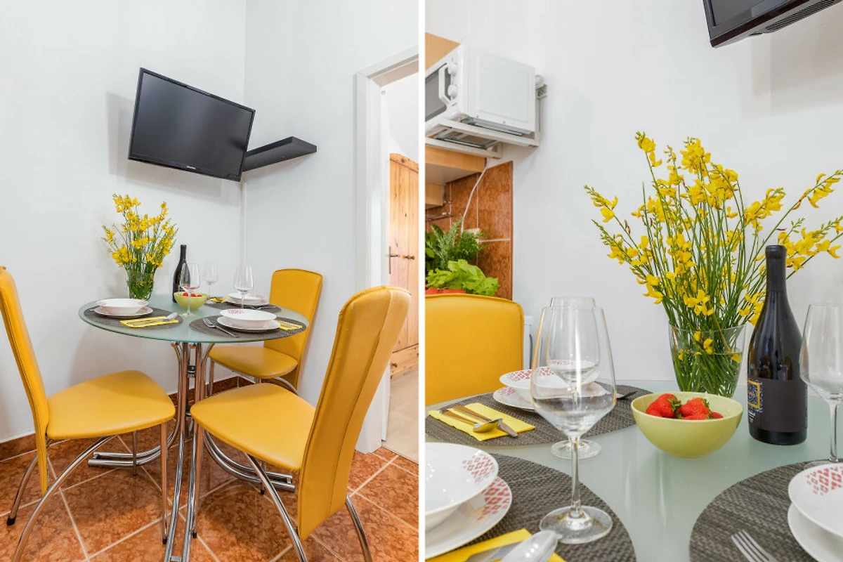 Die Wohnung verfügt über eine gut ausgestattete amerikanische Küche mit modernen Annehmlichkeiten, einschliesslich eines Induktionskochfelds, Kühlschrank, Gefrierschrank, Waschmaschine, Kaffeemaschine, Mikrowelle, Toaster und kompletter Küchenausstattung. Ein gemütlicher Wohnbereich bietet einen Satelliten-TV zur Unterhaltung.