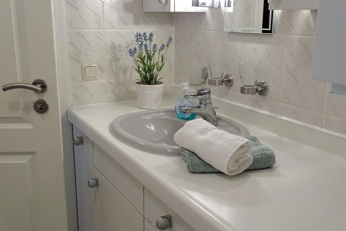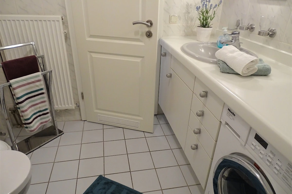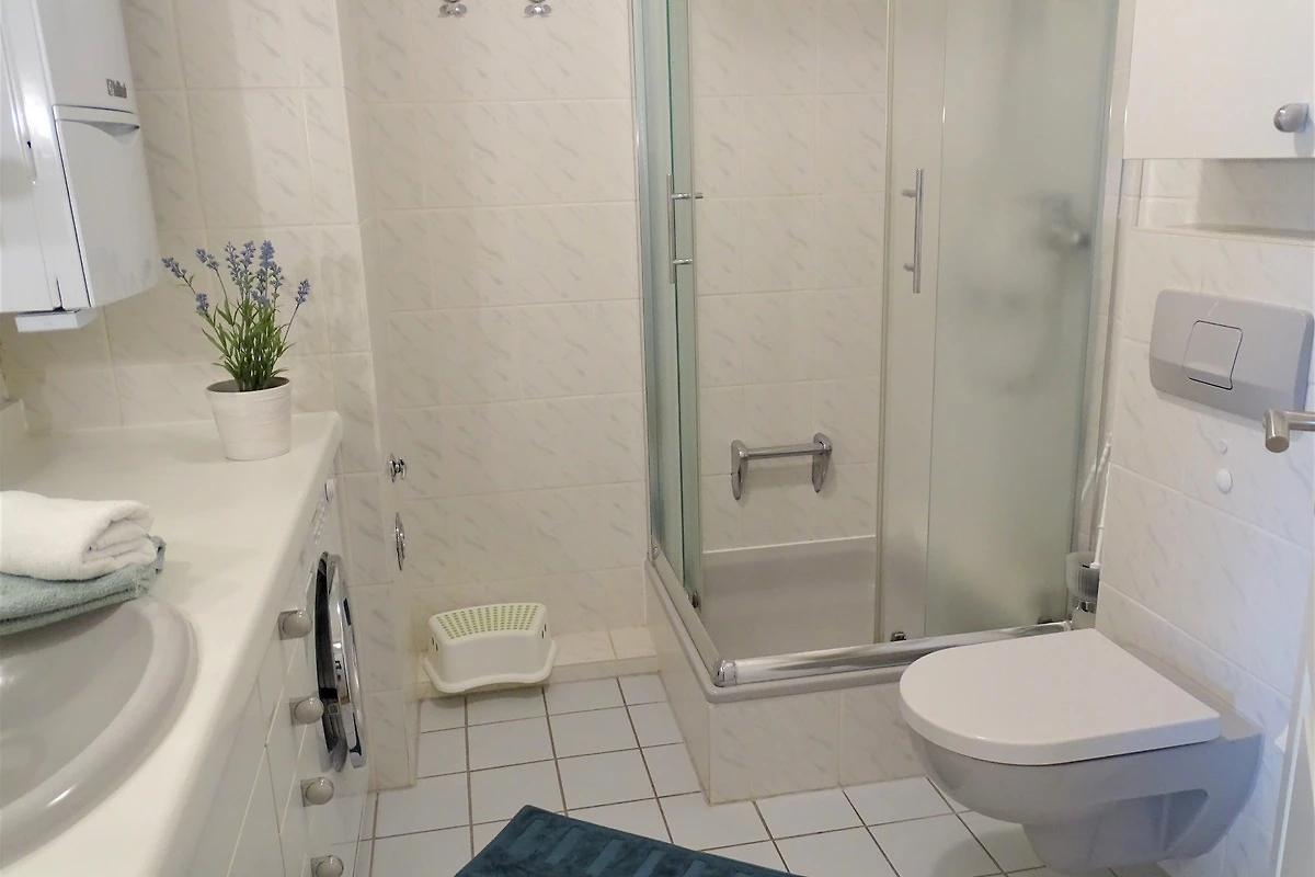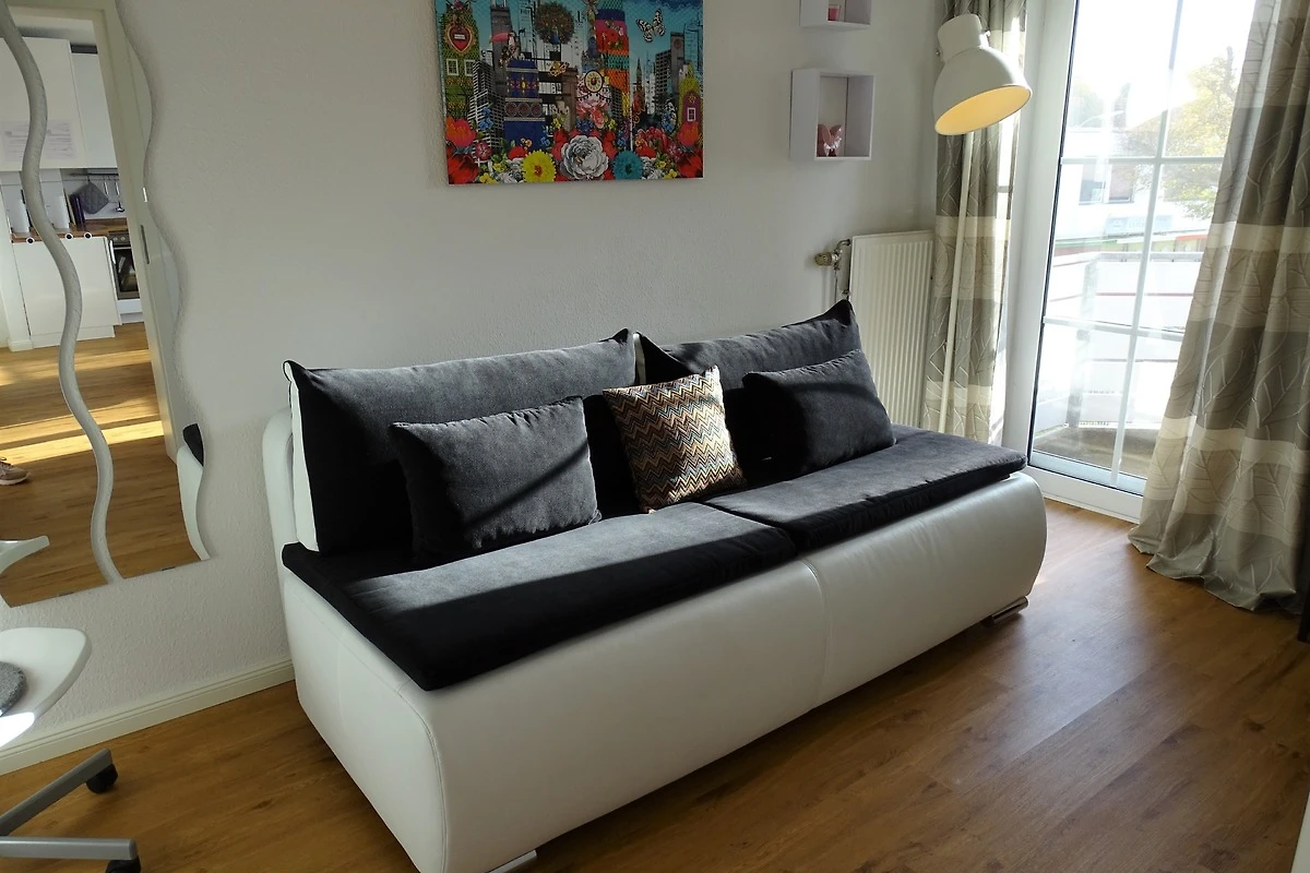 Dieses Ferienobjekt ist liebevoll und modern eingerichtet und verfügt als einziges Ferienobjekt in dieser Appartementanlage über 2 separate Schlafzimmer und 3 kleine Balkone. Sie befindet sich in der 1. Etage der schönen Appartementanlage und ist wie folgt aufgeteilt: Eingangsbereich mit Garderobenschrank, Badezimmer mit Dusche, WC, Waschmaschine, Schlafzimmer mit Doppelbett (180x200cm), Kleiderschrank und Balkon, Wohnzimmer mit offener komplett ausgestatteter Küche, Esstisch mit Bestuhlung, Couchgarnitur, Relaxsessel und Balkon, sowie dem 2. separaten Schlafzimmer mit einer praktischen und bequemen Schlafcouch (160x200cm) für 2 Personen, Kleiderschrank und Balkon. Ausrichtung der Wohnung ist in Richtung des Kurparks ( Sonnenseite ). Die Schlafzimmer verfügen über Aussenjalousien. Ein eigener Kfz- Stellplatz befindet sich am Haus. Ein Gemeinschaftsfahrradkeller im Haus, sowie ein weiterer Abstellplatz für Fahrräder befindet sich am Haus. Luftlinie zum Wasser ca. 80m und Fussweg ca. 200m.