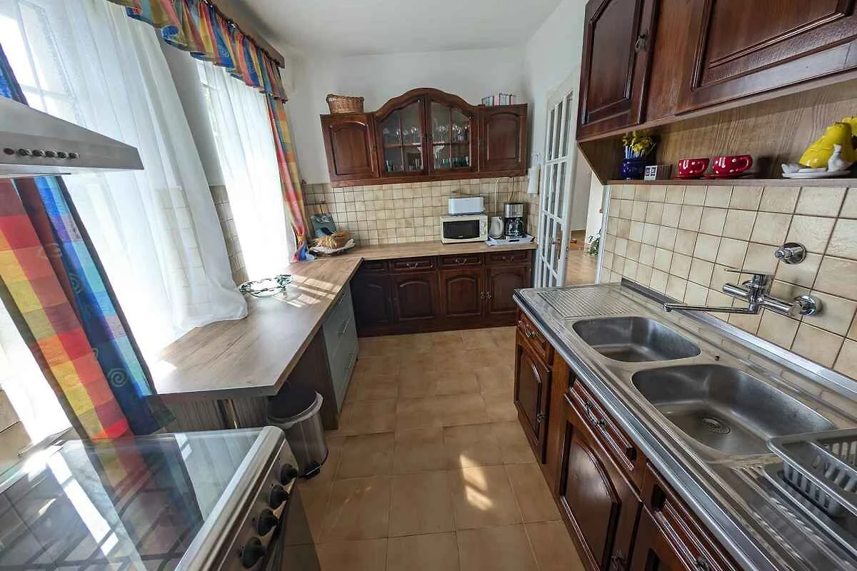 Erdgeschoss: Wohnzimmer mit Sitzecke, TV und Essecke (10 Plätze). Alle Fenster und Aussentüren sind mit Fliegengittern gesichert. Schlafzimmer (Durchgangszimmer) mit 2 Einzelbetten. Schlafzimmer mit 1 Doppelbett. Alle Fenster und Aussentüren sind mit Fliegengittern gesichert. Küche mit Gasherd (4 Flammen), Backofen, Dunstabzugshaube, Geschirrspüler, Kühlschrank (Eisfach), Mikrowelle, Kaffeemaschine, Toaster und elektrischem Wasserkocher. Alle Fenster und Aussentüren sind mit Fliegengittern gesichert. Bad mit Badewanne, 2 Waschbecken und Fenster. Alle Fenster und Aussentüren sind mit Fliegengittern gesichert. Separates WC mit 1 Waschbecken, WC und Fenster.
