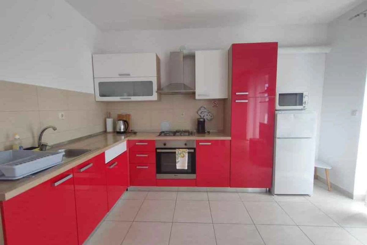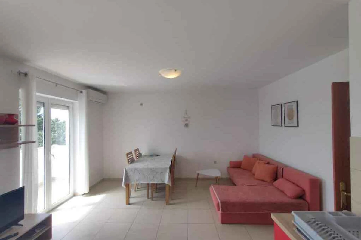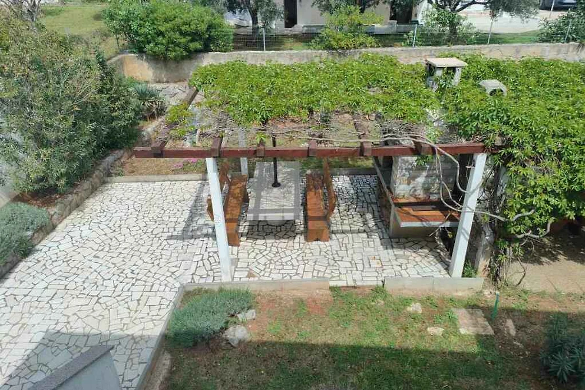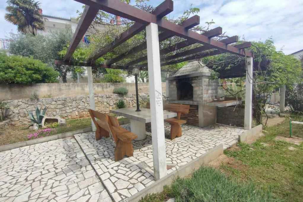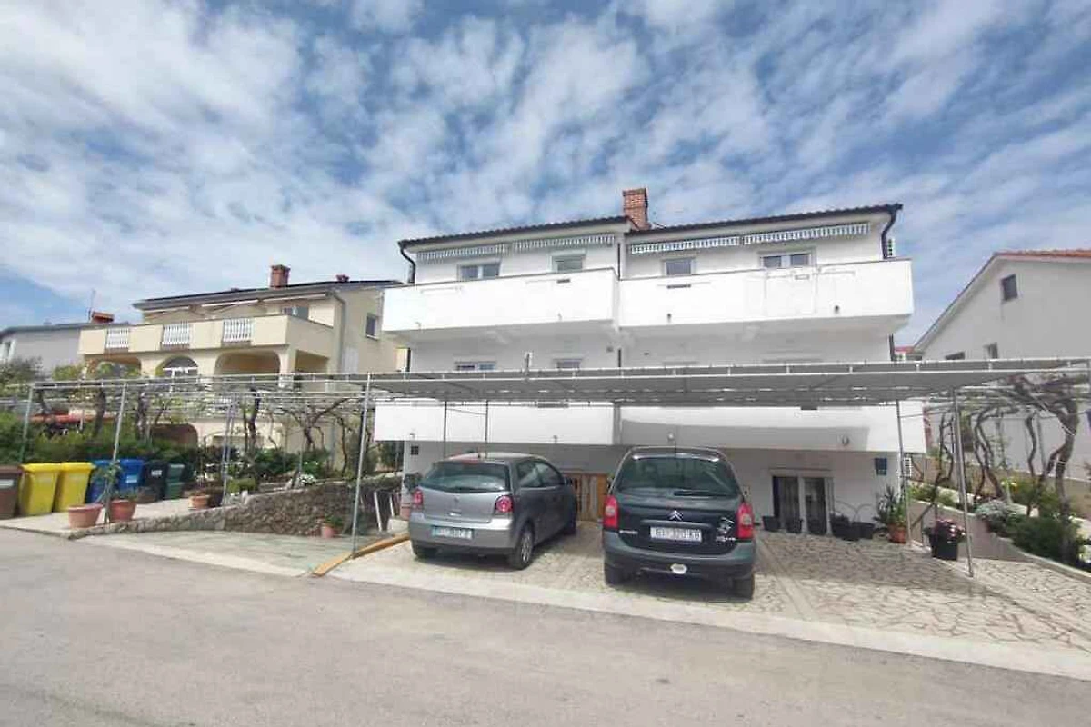 Krk. Die Ferienwohnung befindet sich auf einem geschlossenen Grundstück mit Blumen, von einer Hecke begrenzt. Der Vermieter wohnt ständig im Haus, nutzt jedoch einen separaten Eingang. erster Stock, rot. Die Zufahrt erfolgt direkt von der Hauptstrasse (asphaltiert). Parkplatz auf dem Grundstück.