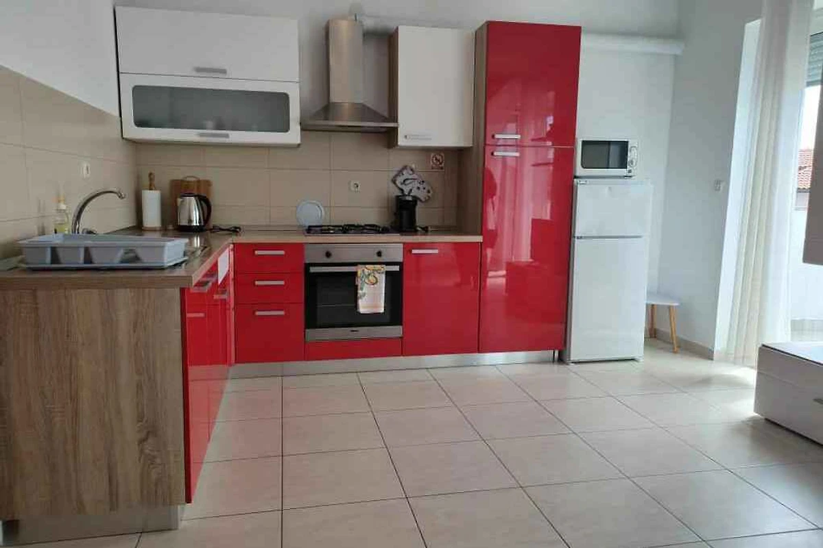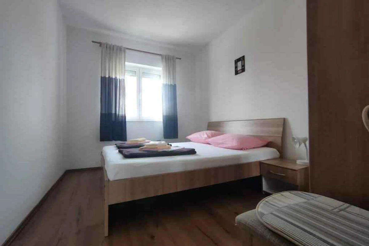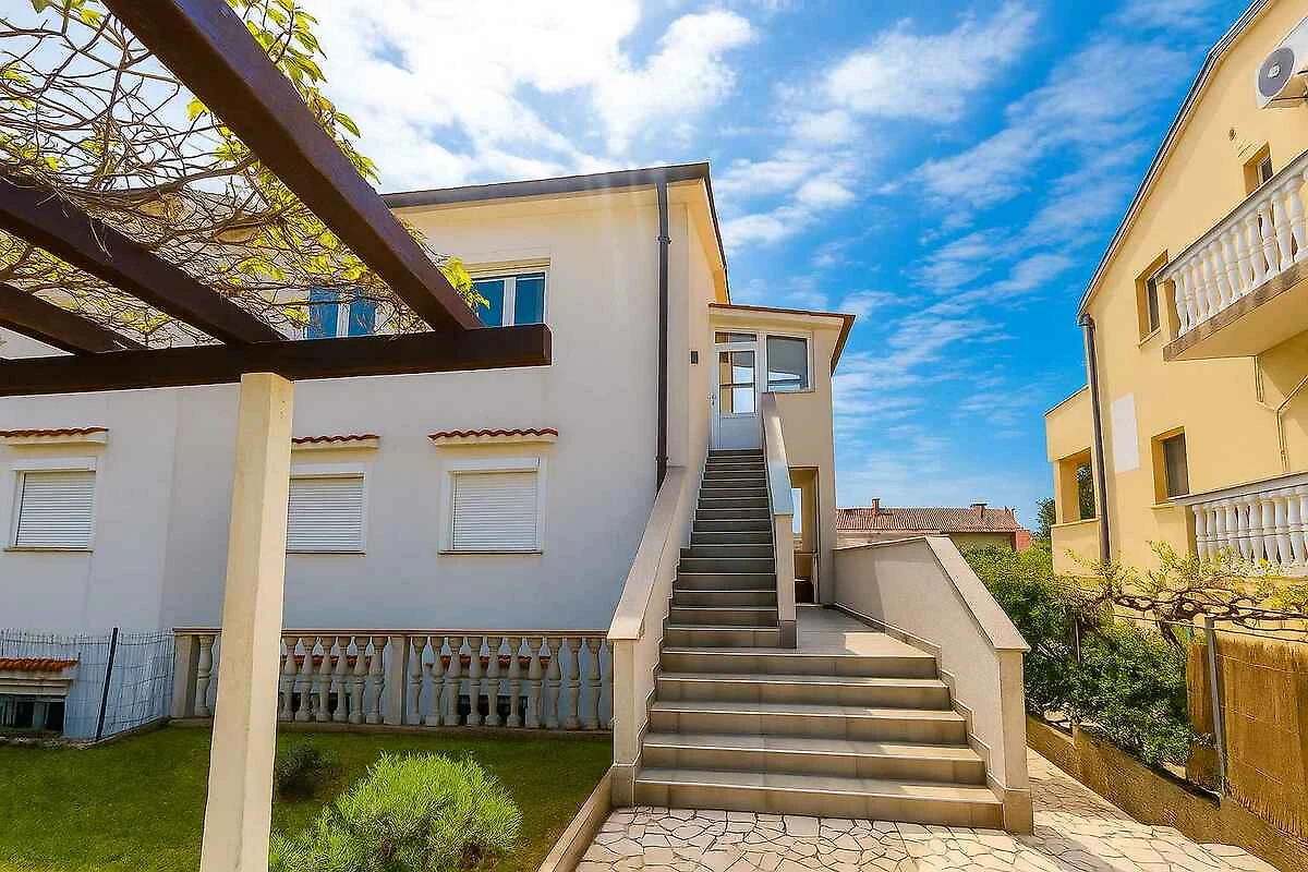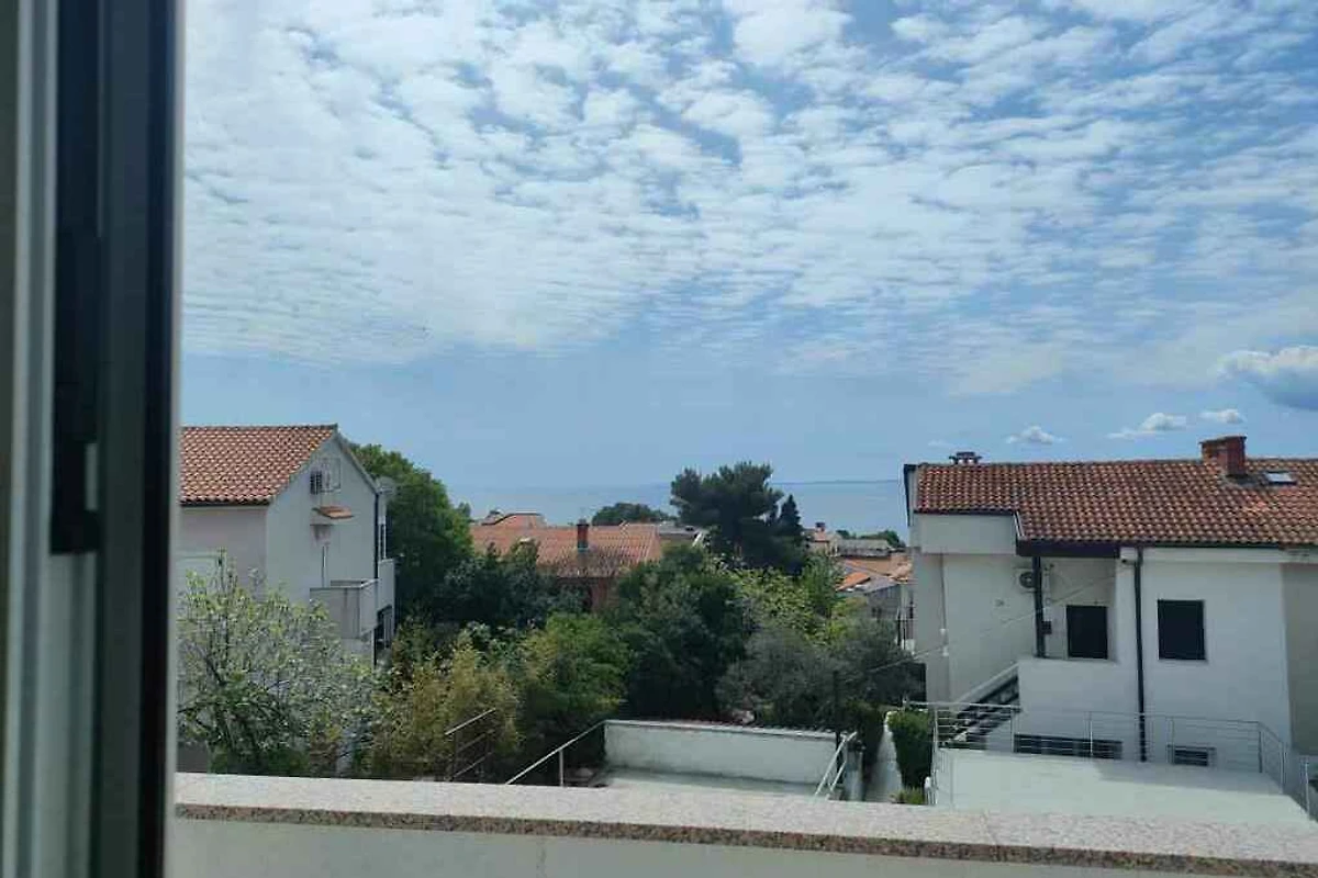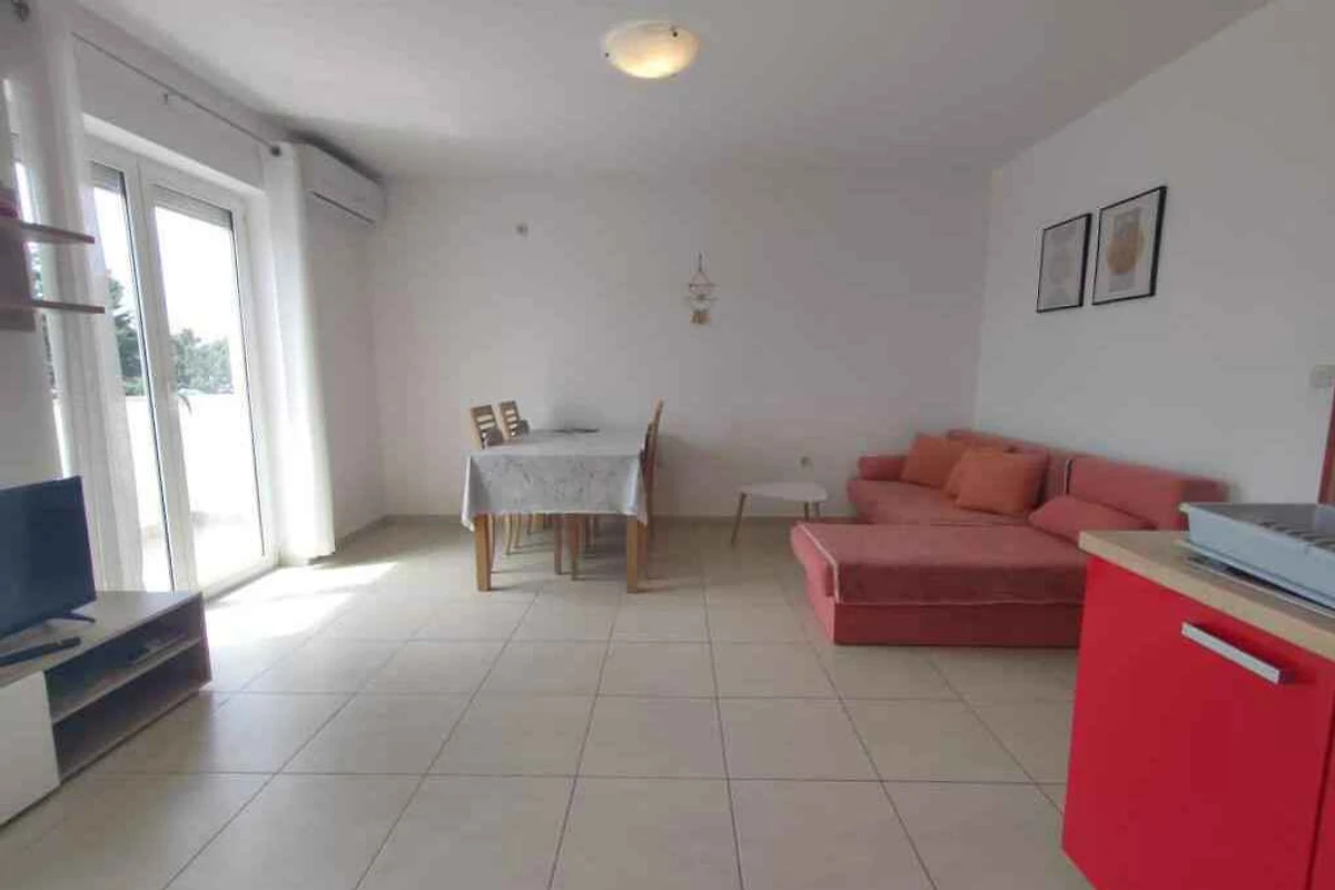 Krk. Die Ferienwohnung befindet sich auf einem geschlossenen Grundstück mit Blumen, von einer Hecke begrenzt. Der Vermieter wohnt ständig im Haus, nutzt jedoch einen separaten Eingang. erster Stock, rot. Die Zufahrt erfolgt direkt von der Hauptstrasse (asphaltiert). Parkplatz auf dem Grundstück.