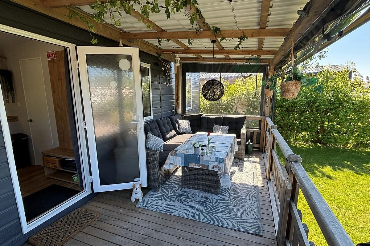 Die Terrasse ist eine umlaufende Veranda, die mit einer großen überdachten Loungesitzecke ausgestattet ist. Sollte es mal windig oder nass werden, können Sie diese Loungesitzecke mit den vorhandenen Segeln schließen und weiter nutzen.