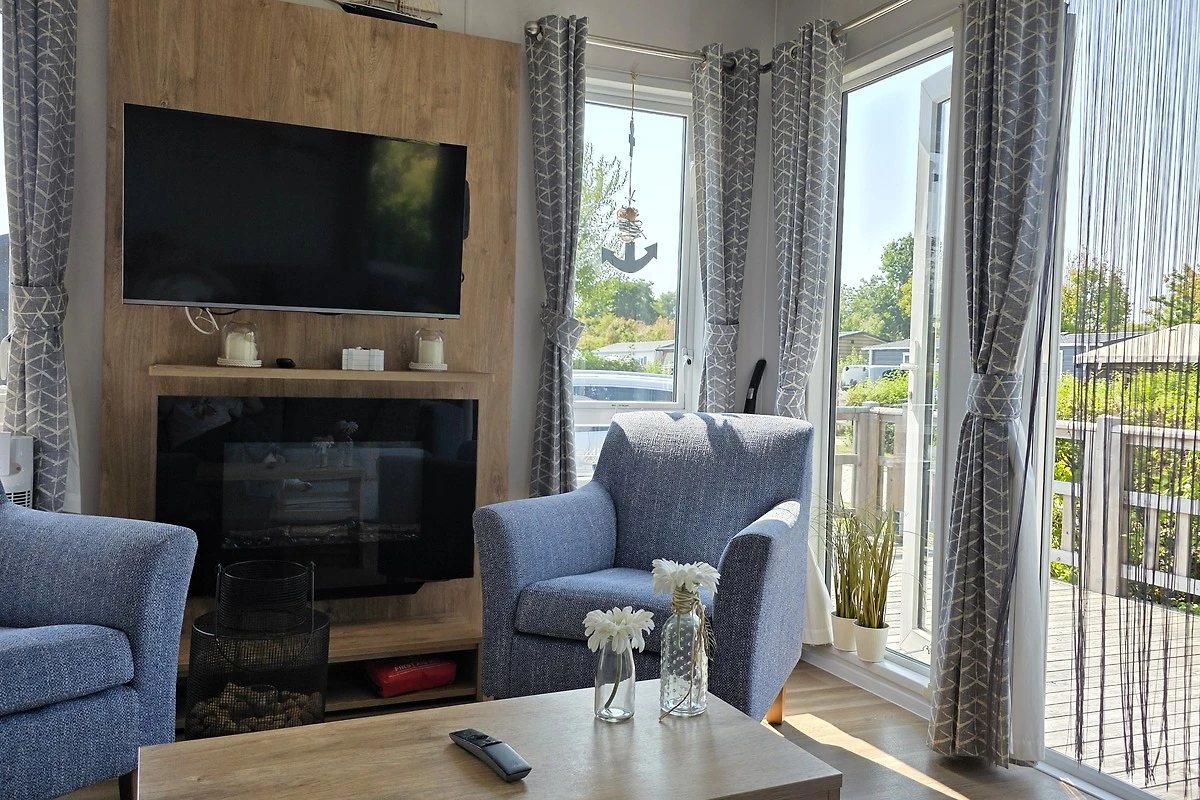 Im Wohnzimmer können Sie auf der Couch und den zwei Sesseln den Abend gemütlich ausklingen lassen, Fernsehen schauen, Radio hören und vor dem Elektro-Atmosphären-Kamin entspannende Momente verbringen. Vom Wohnzimmer aus gibt es einen extra Ausgang zur Relaxecke auf der Terrasse.