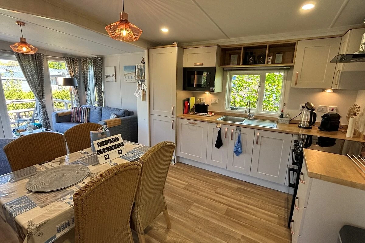 Die offene Küche ist vollständig eingerichtet. Mit einer zusätzlichen Ausstattung von Spülmaschine, 2 Backöfen, einem extra Airfryer, einer Mikrowelle, Kühl-/Gefrierkombination und zwei Kaffeemaschinen (eine Nespresso-Kapselmaschine und eine Senseo-Padmaschine) hoffen wir allen Ansprüchen gerecht zu werden.