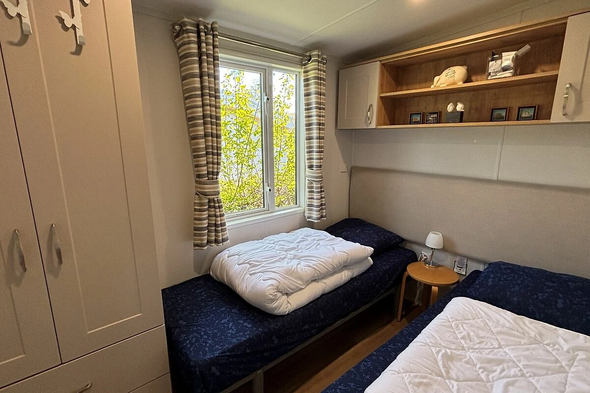 Das Hauptschlafzimmer ist mit einem bequemen Box-Springbett (160 x 200 cm) und Fernseher ausgestattet. Im zweiten Schlafzimmer stehen zwei Einzelbetten (je 80 x 200 cm).