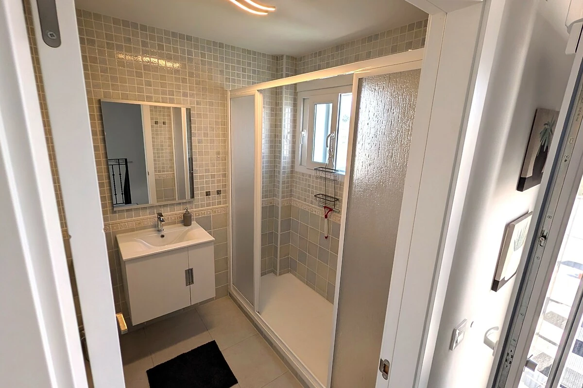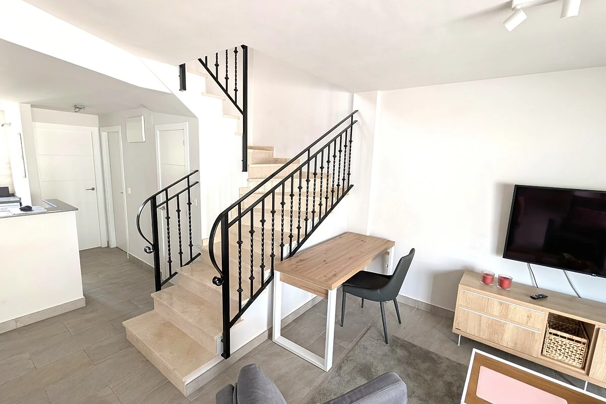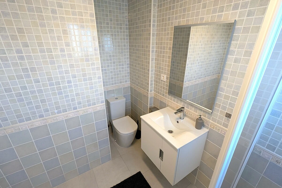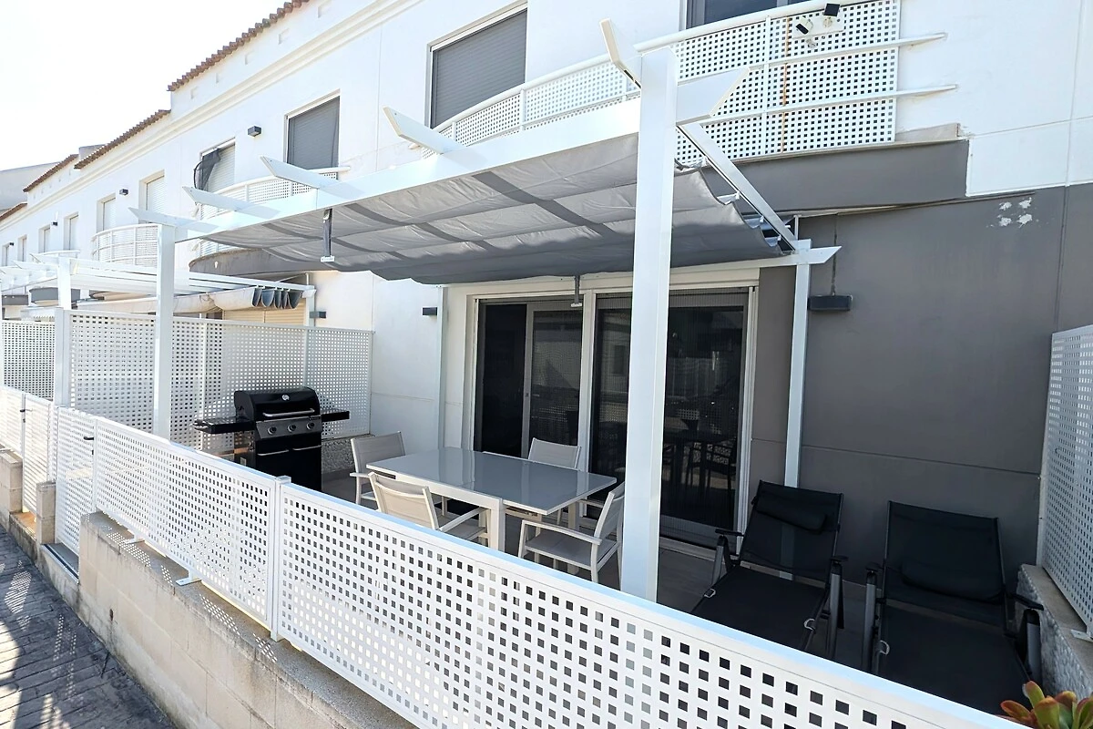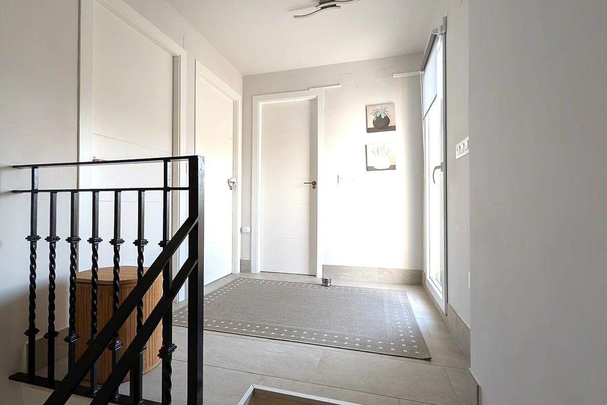 Die Ausstattung des Hauses ist modern und neuwertig: Fliesenböden, weiße, doppelt verglaste neue Fenster, Fliegengitter (Moskitoschutz) an allen Fenstern, Rollläden, Sicherheitseingangstür und Marmortreppe nach oben, Einbauschränke, moderne Klimaanlagen warm/kalt in allen Räumen, zwei Terrassen, zwei Smart TV, großer Gemeinschaftspool, Einbauküche mit Waschmaschine, Spülmaschine, Kühl-Gefrierkombination, Induktionskochfeld, Elektrobackofen, Dunstabzugshaube, Kaffeemaschine (Delonghi + Filter), Toaster, Internet.