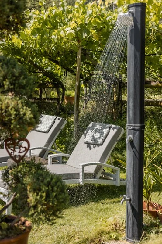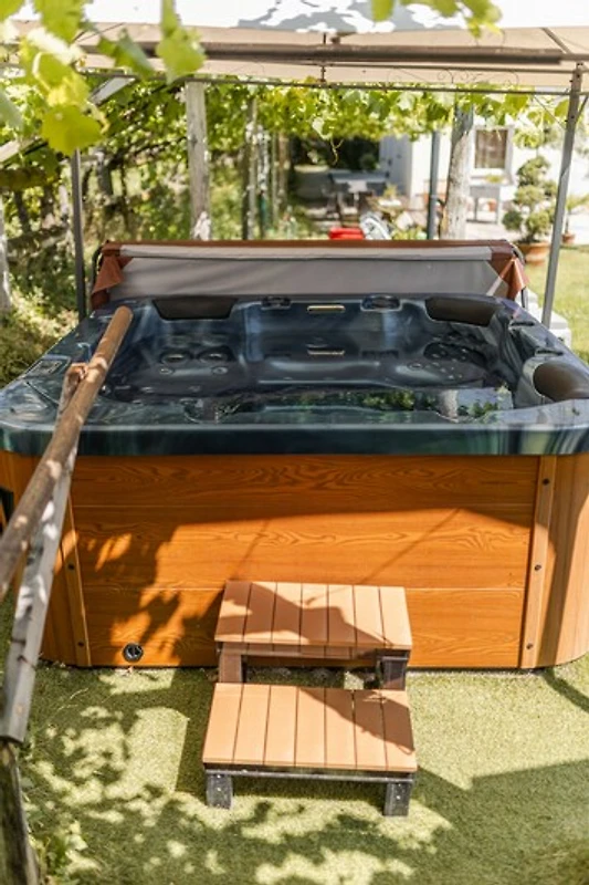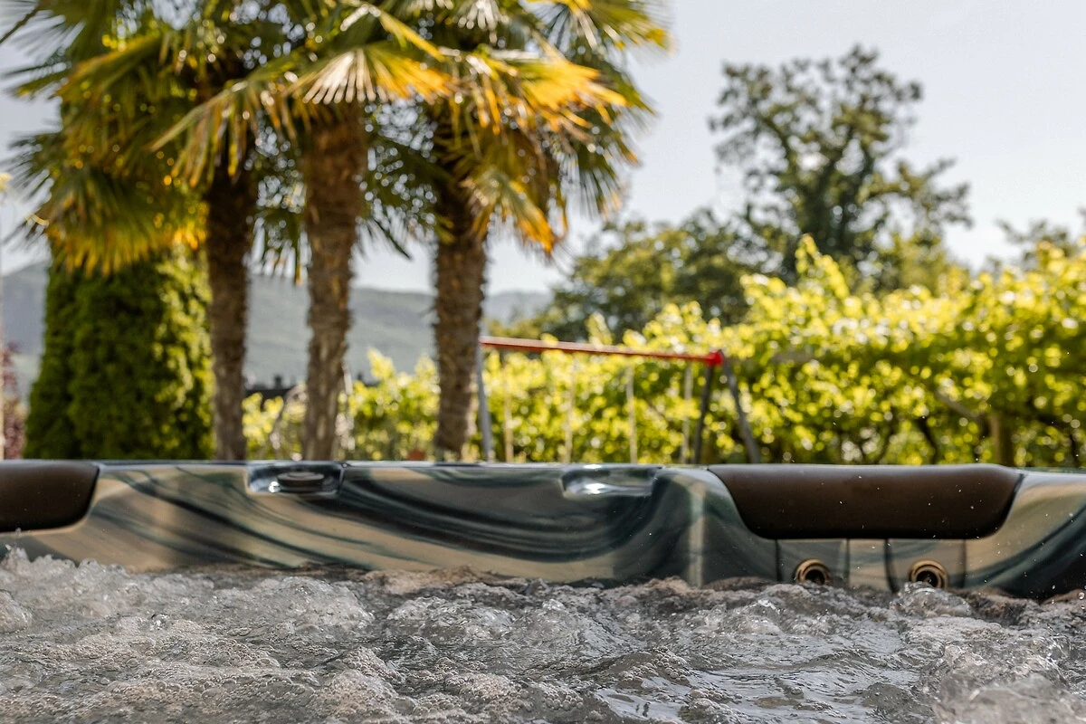 Ein sanft plätschernder Bach direkt neben dem Haus sorgt für Entspannung, während unser Whirlpool unter der Weinlaube zum Verweilen einlädt – mit Blick auf Palmen und die Liegewiese.