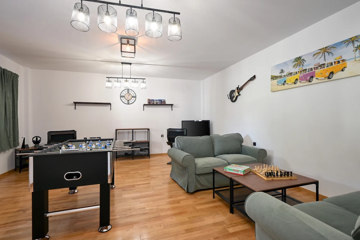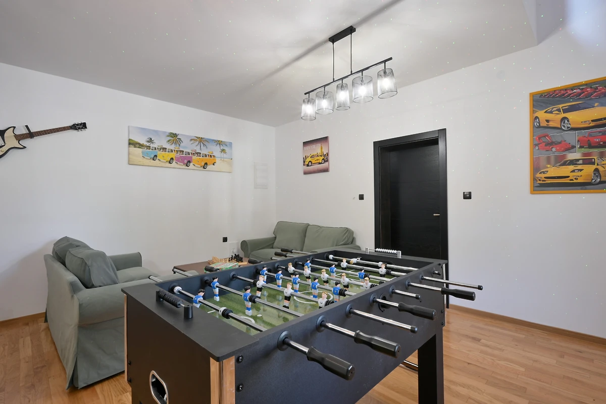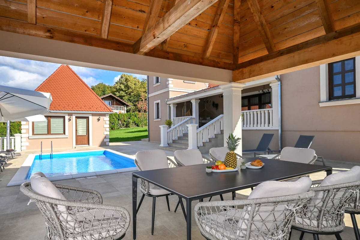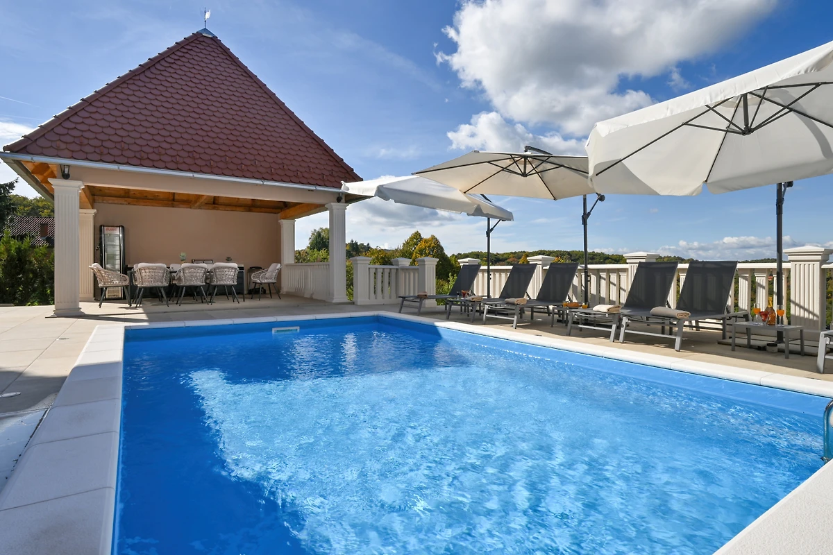 Zusätzliche Ausstattungsmerkmale umfassen 4 überdachte private Parkplätze, eine Sauna und einen Kinderbereich. Gelegen in der ruhigen ländlichen Umgebung von Beretinec, befindet sich die Villa nur 6 Kilometer von Varaždin entfernt und bietet einen friedlichen Rückzugsort mit einfachem Zugang zu lokalen Einrichtungen. Bitte beachten Sie, dass Haustiere nicht erlaubt sind und die Immobilie nicht für Jugendgruppen geeignet ist.