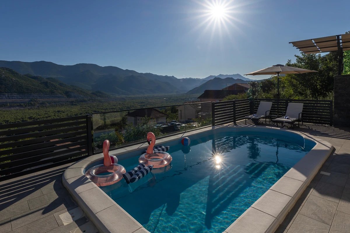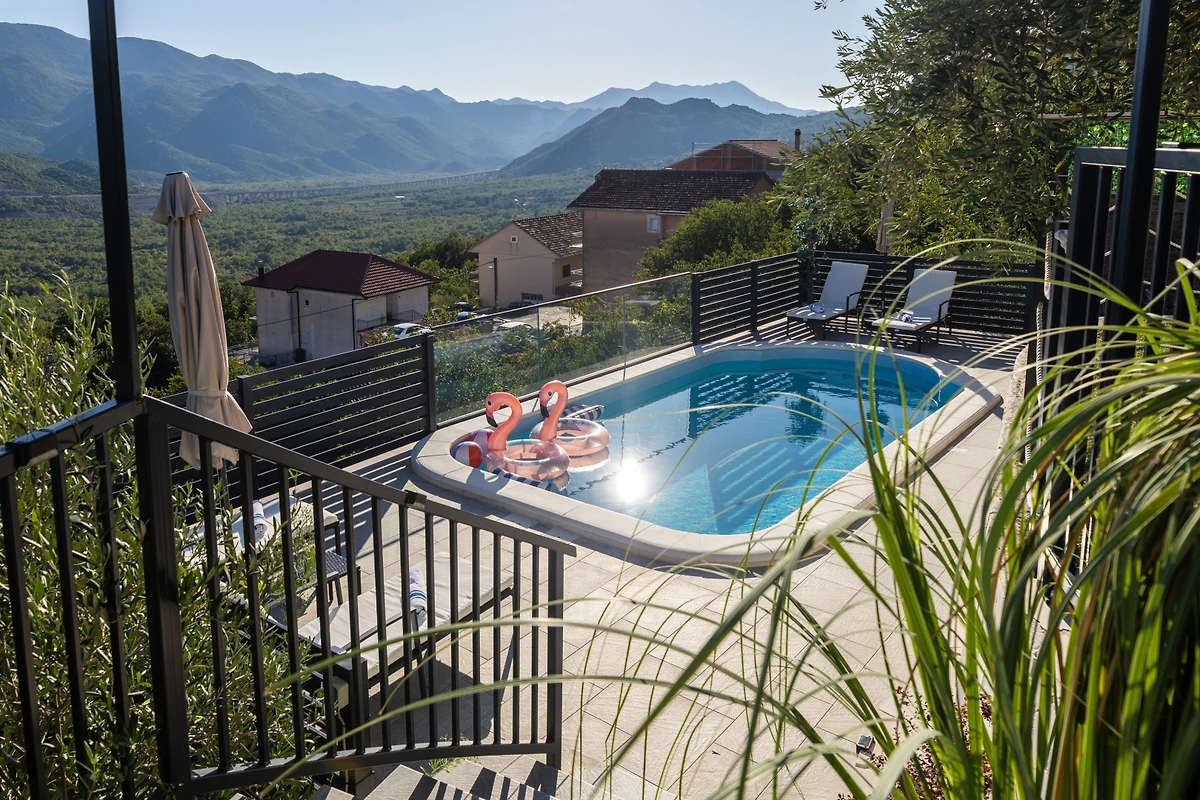 Naturliebhaber werden den privaten beheizten Swimmingpool mit einer Grösse von 3,5x7 Metern lieben, der perfekt für erfrischende Abkühlung ist. Der Garten wird wunderschön gepflegt und umfasst Gartenmöbel und einen Grillbereich, ideal für Mahlzeiten im Freien. Die Terrasse bietet atemberaubende Ausblicke auf die Berge, den Pool und den umliegenden Garten.