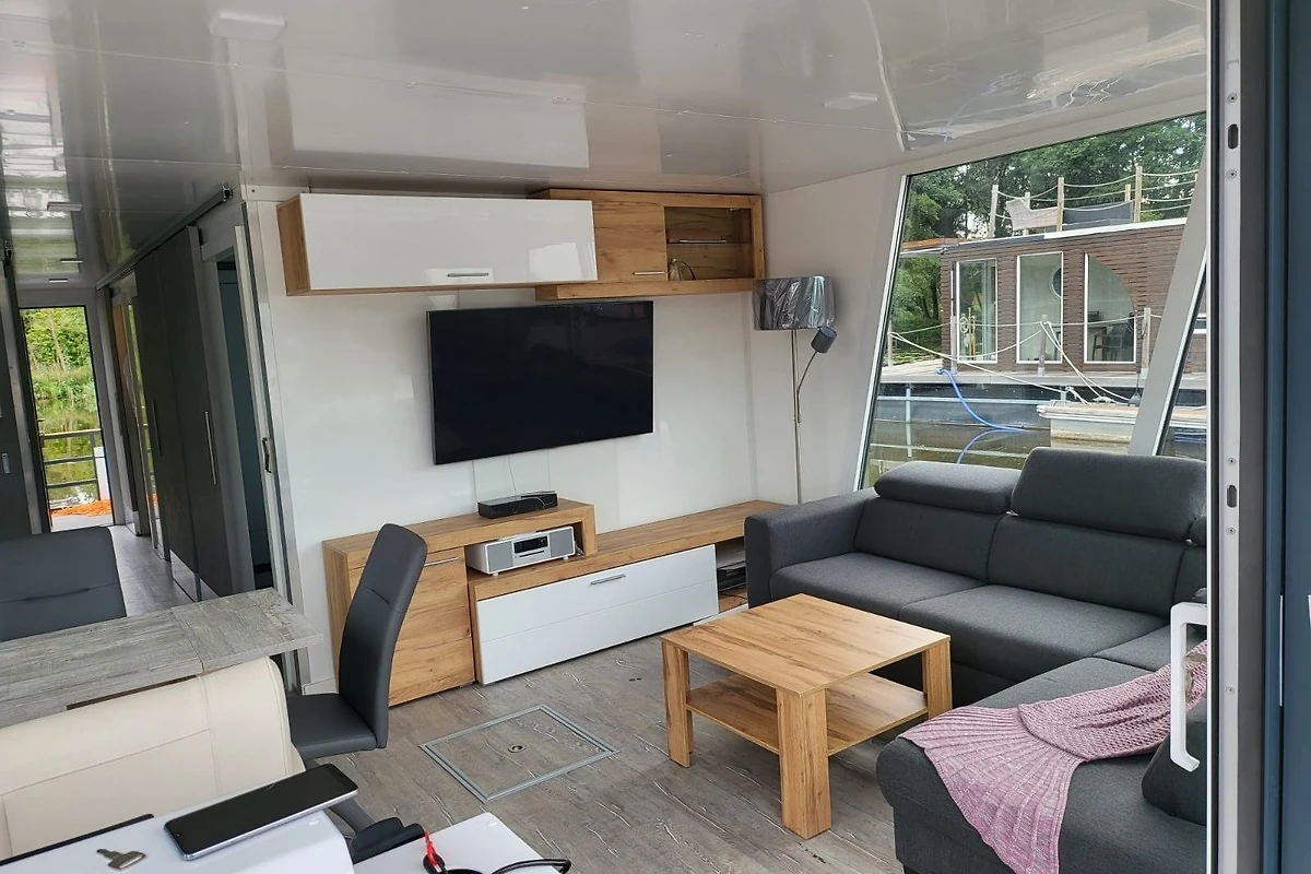 Neben dem Fahrkomfort erwartet Sie ein angenehmer Wohnraum, der zum entspannen einlädt. Das Hausboot ist eine moderne leichte Konstruktion und zeichnet sich besonders durch seine hohe Wärme - und Kältedämmung mit einem hohen Schallschutz aus, zudem befindet sich eine Yachtheizung mit Warmwasserbereiter an Bord. Um autark sein zu können, gibt es je einen 480l Frisch- und Abwassertank.