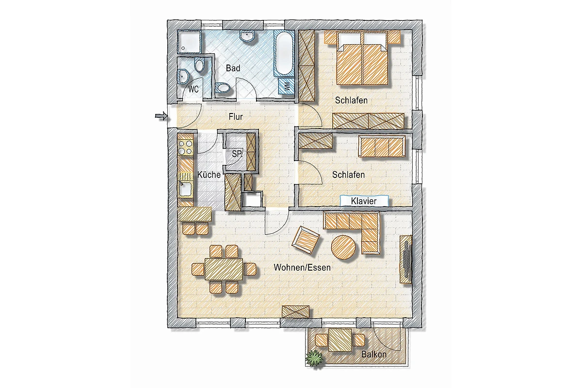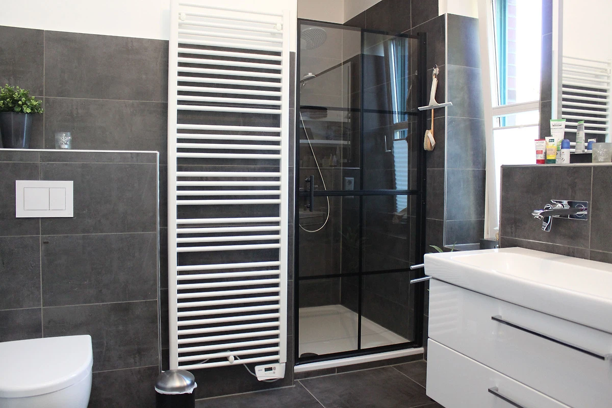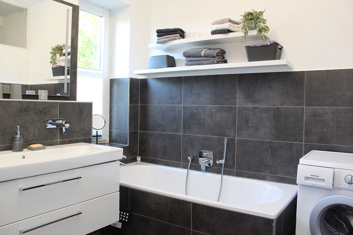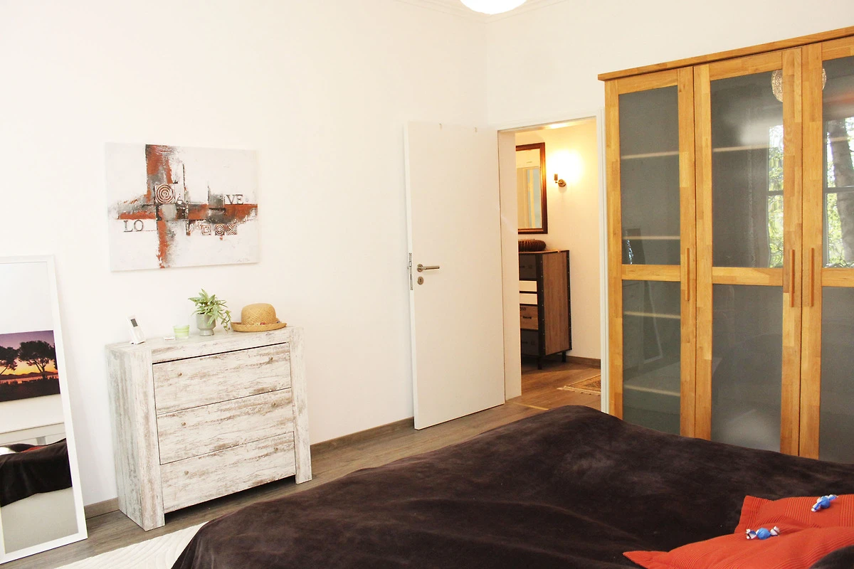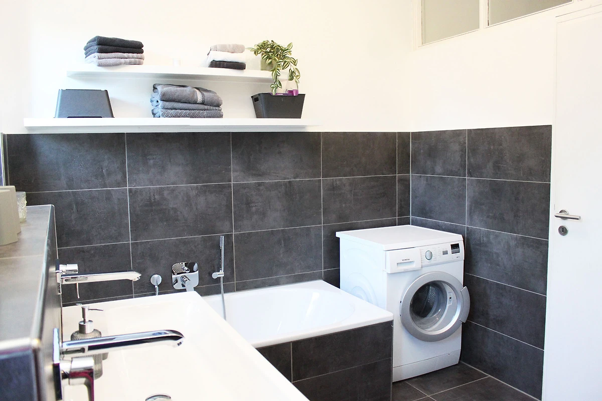 Sie erreichen die Wohnung im 1. OG über einen kleinen Flur. Von der modernen offenen Küche gelangen Sie in den grosszügigen und hellen Wohn-/Essbereich. Die Wohnung verfügt über ein Schlafzimmer mit Doppelbett (160cm) sowie ein weiteres kleines Schlafzimmer mit einem Schlafsofa. In diesem Zimmer befindet sich auch ein Klavier. Das moderne Bad verfügt neben einer geräumigen Dusche auch über eine Badewanne und eine Waschmaschine. Ein separates Gäste-WC steht ebenso zur Verfügung.