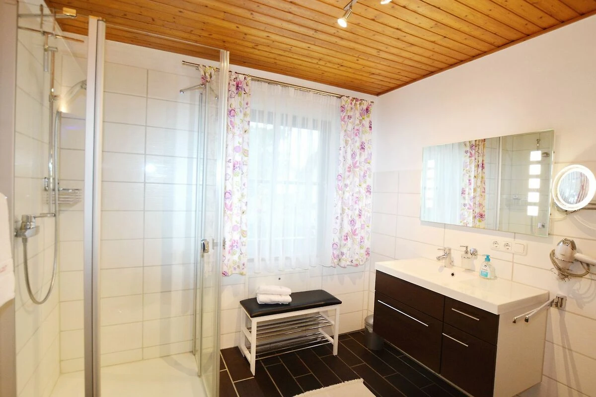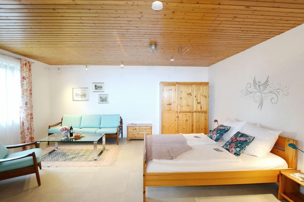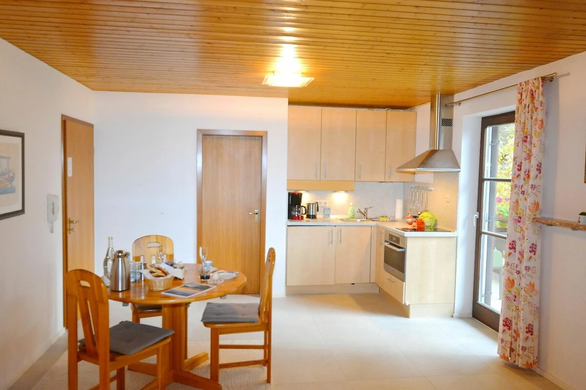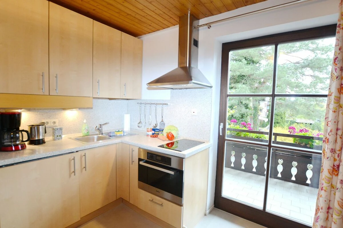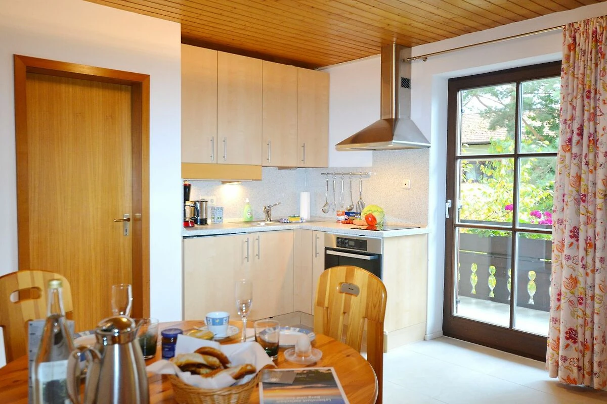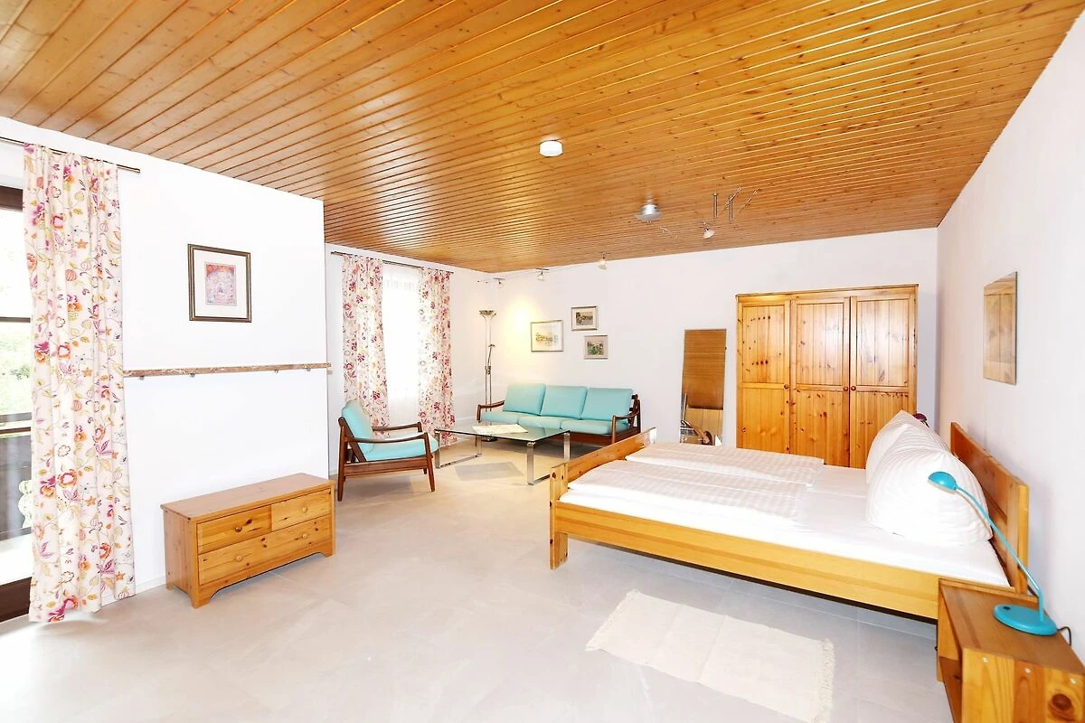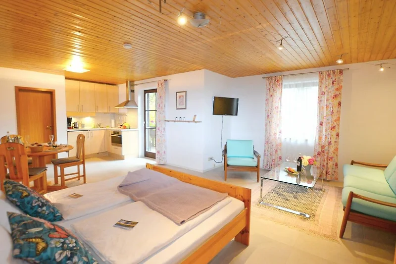 Der offene, sehr geräumige Wohn-, Ess- und Schlafbereich überzeugt mit einer Wohnecke, Flatscreen-TV, Essbereich und offener Küche. Eine Sitzecke mit Tisch und Stühlen bietet genug Platz zum Speisen, Verweilen oder auch mal zum Arbeiten. Die Küche mit einem Zwei-Platten-Herd und Backofen ist mit allen wichtigen Utensilien, die zum Kochen benötigt werden, ausgestattet. Vom Küchenbereich aus betreten Sie den Ost-Balkon - hier können Sie die Sonnenaufgänge bei einer Tasse Kaffee geniessen. Ideal zum Frühstücken in der aufgehenden Chiemgauer Morgensonne.
