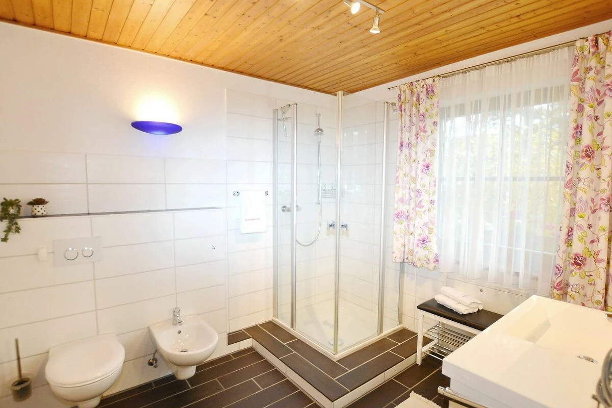 Ein grosses und modernes Bad, ausgestattet mit Dusche, WC, Bidet, Waschbecken, Haartrockner bietet viel Platz für die Privatsphäre.