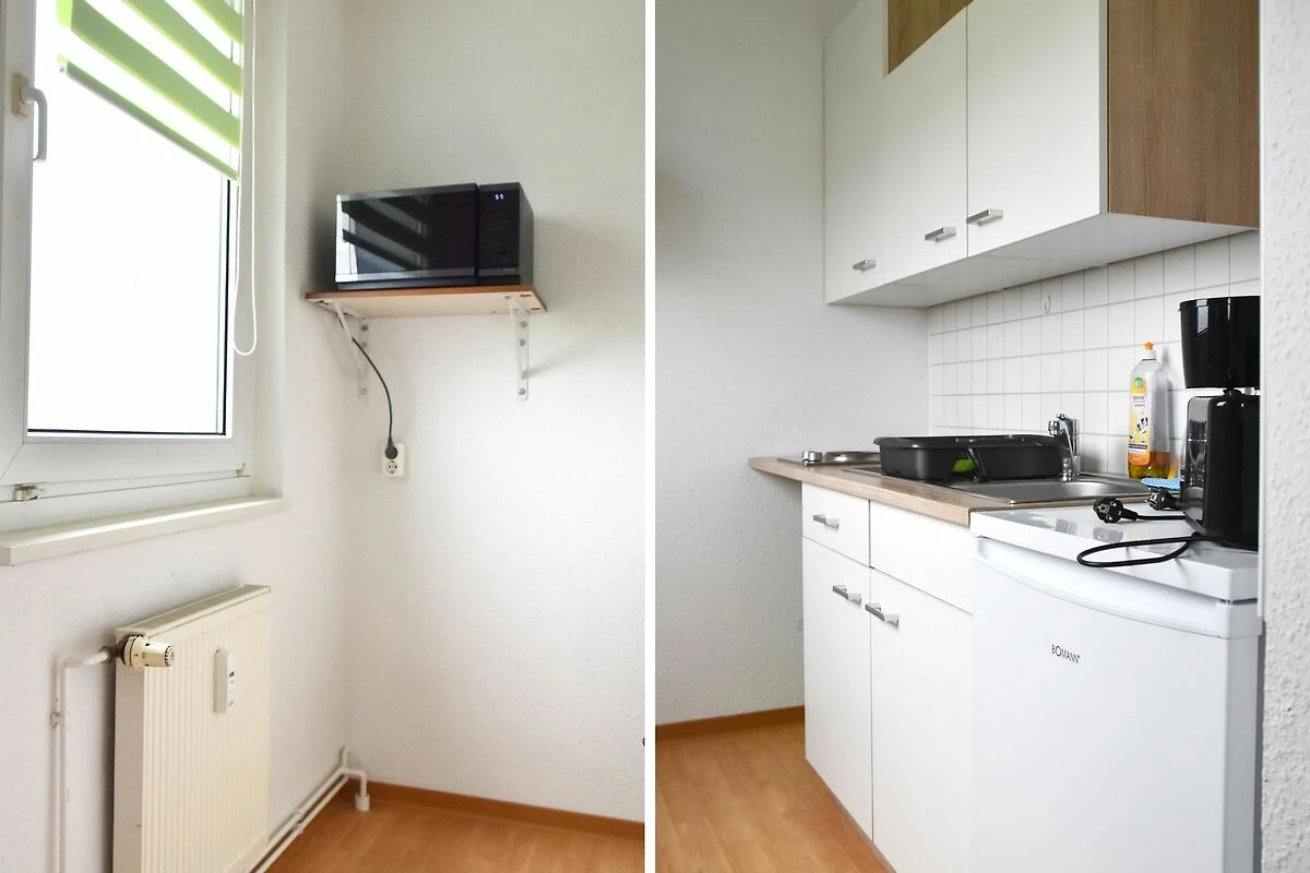 Die Gästewohnung in der Platanenstr. 1, Zi. 440 verfügt über 1 Wohnzimmer, 1 Küche und 1 Bad mit Dusche.