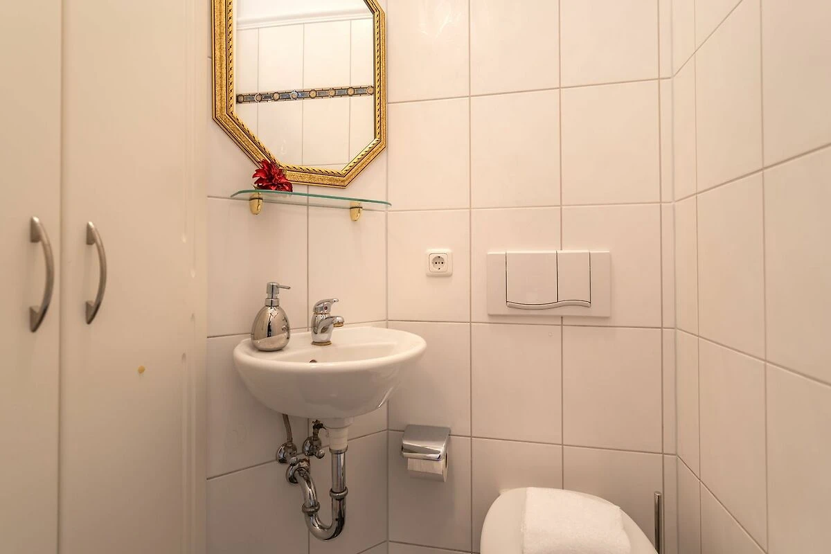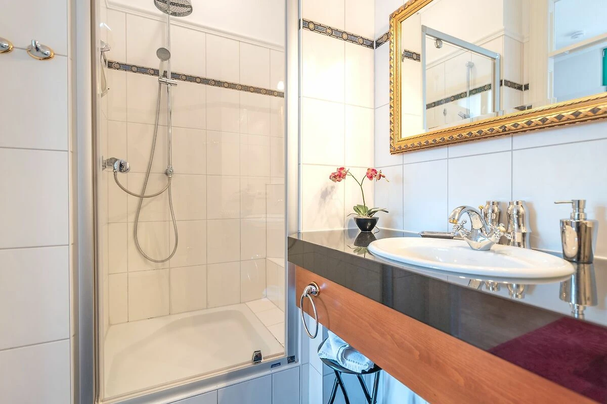 Das Badezimmer ist stilvoll ausgestattet mit Dusche, WC, Waschbecken, Fussbodenerwärmung und Handtuchheizkörper. Praktisch bei voller Belegung: ein zusätzliches Gäste-WC sorgt für mehr Komfort.