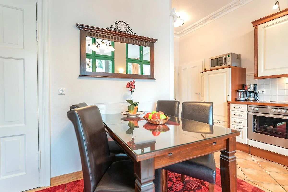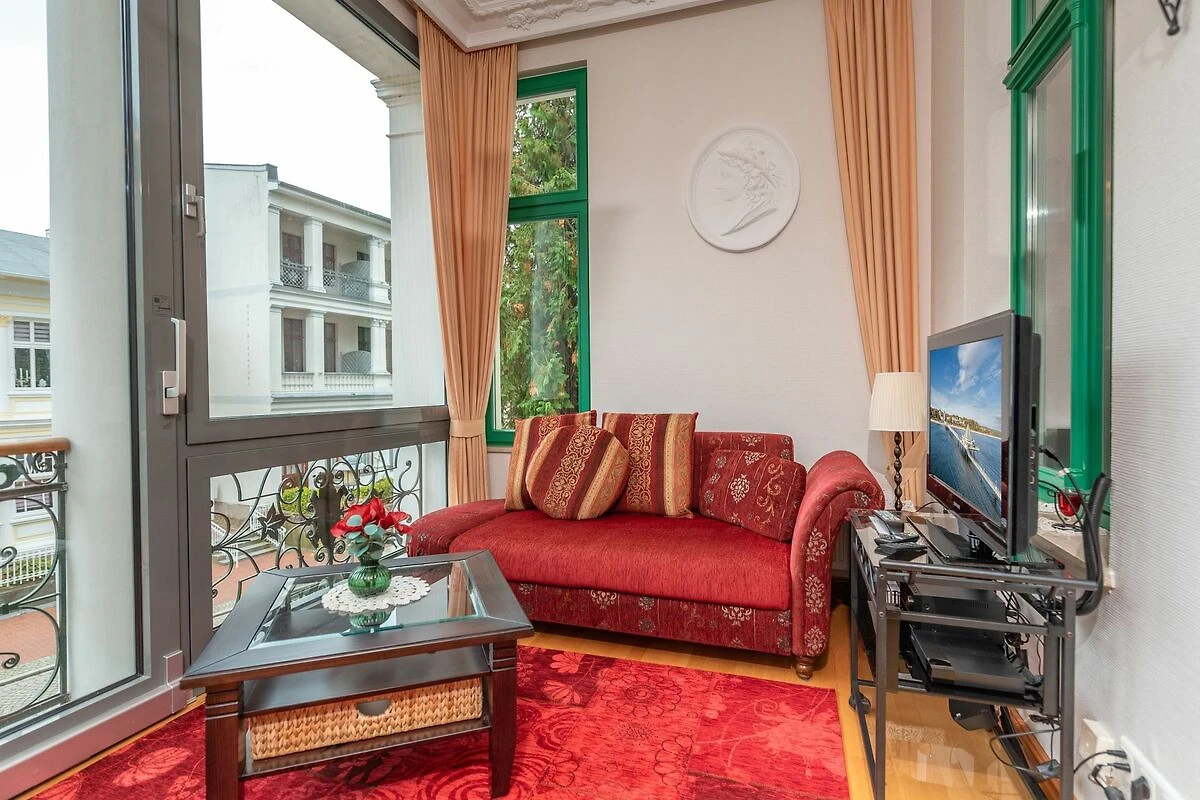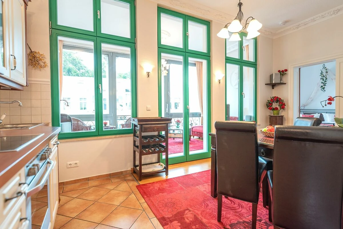 Die Wohnung ist komplett ausgestattet und überzeugt mit einem geschmackvoll gestalteten Küchen- und Essbereich. In der verglasten Loggia laden eine gemütliche Sitzgruppe und eine Leseecke zum Entspannen ein. Für Unterhaltung sorgt ein moderner Flachbild-TV noch schöner ist es jedoch, im komfortablen Lehnsessel bei einem Glas Wein den Blick über die umliegende Bäderarchitektur schweifen zu lassen. Für unsere kleinen Gäste können auf Wunsch ein Kinderreisebett und ein Kinderhochstuhl kostenfrei bereitgestellt werden.