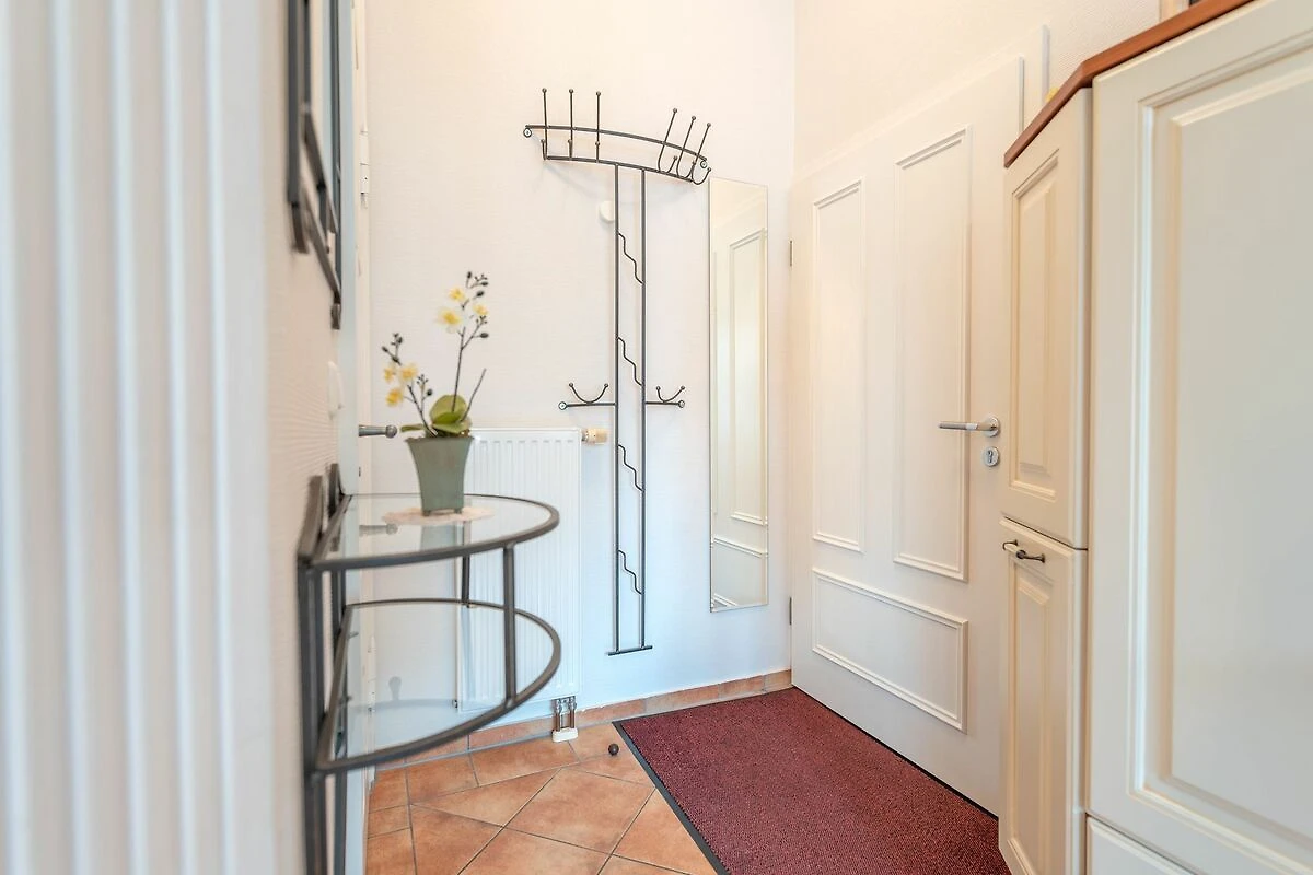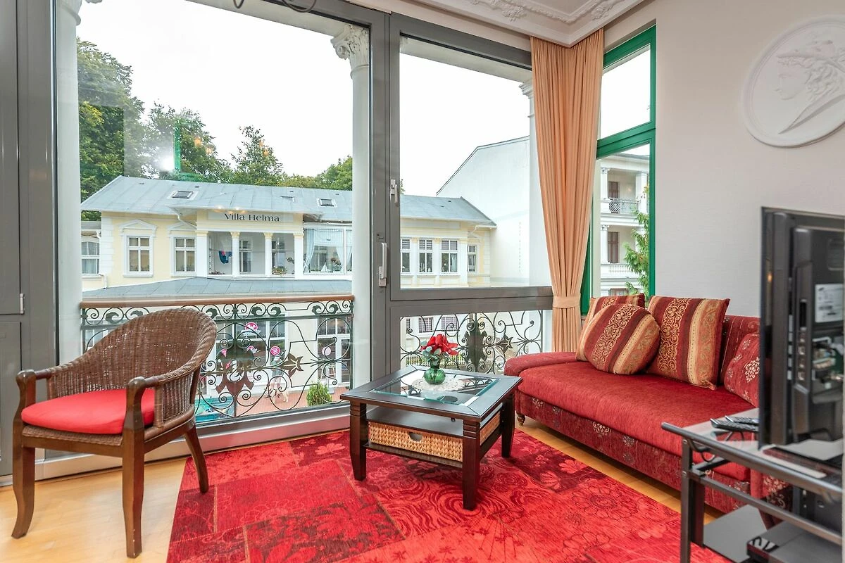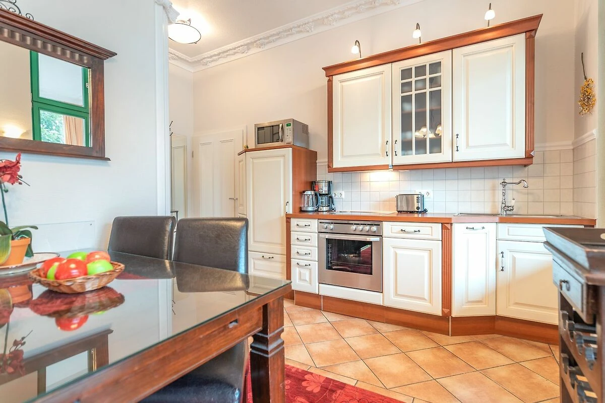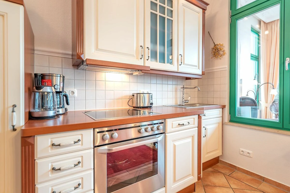 Die Wohnung ist komplett ausgestattet und überzeugt mit einem geschmackvoll gestalteten Küchen- und Essbereich. In der verglasten Loggia laden eine gemütliche Sitzgruppe und eine Leseecke zum Entspannen ein. Für Unterhaltung sorgt ein moderner Flachbild-TV noch schöner ist es jedoch, im komfortablen Lehnsessel bei einem Glas Wein den Blick über die umliegende Bäderarchitektur schweifen zu lassen. Für unsere kleinen Gäste können auf Wunsch ein Kinderreisebett und ein Kinderhochstuhl kostenfrei bereitgestellt werden.