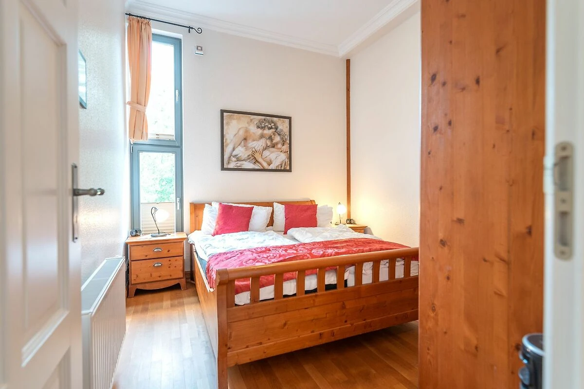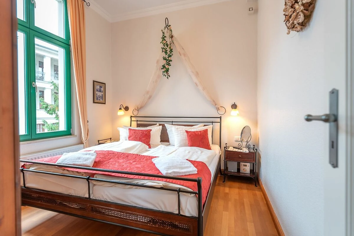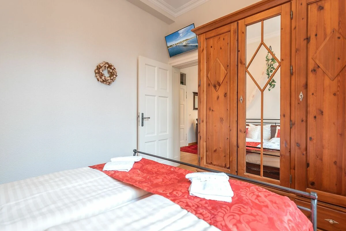 Die Villa Perkunos erstrahlt im Glanz alter Bäderstilzeiten und verbindet historischen Charme mit modernem Komfort. Die strandnahe und dennoch zentrale Lage in Heringsdorf macht die Unterkunft zu einem idealen Domizil für jeden Usedomurlauber. Die 3-Raum-Ferienwohnung Nr. 11 befindet sich in der „Bel Etage“ des Hauses, dem früher bevorzugten Geschoss für Adlige oder Grossbürger. Auf ca. 58 m² bietet sie Platz für bis zu 5 Personen. Ein überdachter PKW-Stellplatz, WLAN sowie Waschmaschine und Trockner (gegen Gebühr) stehen zur Verfügung. Das Grundstück ist umzäunt und durch ein elektrisches Tor gesichert, und Fahrräder können in der sicheren Abstellmöglichkeit im Keller untergebracht werden.