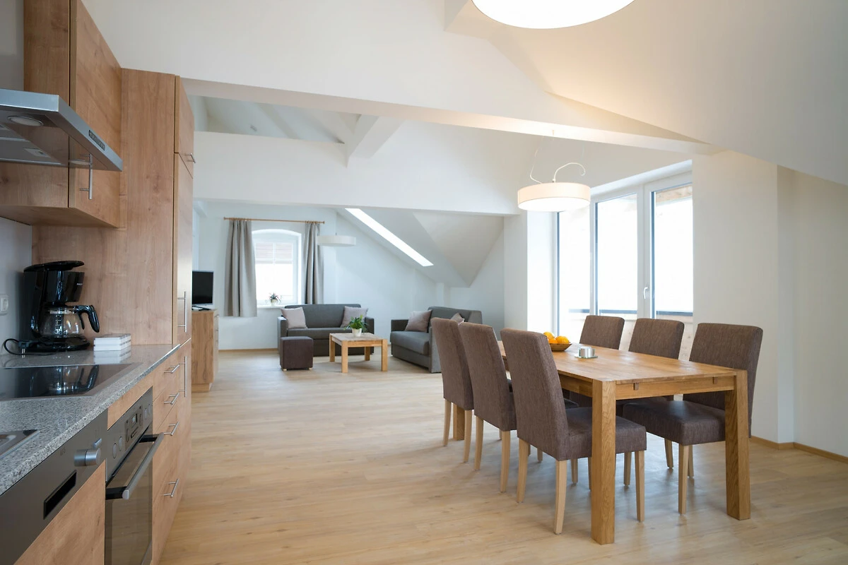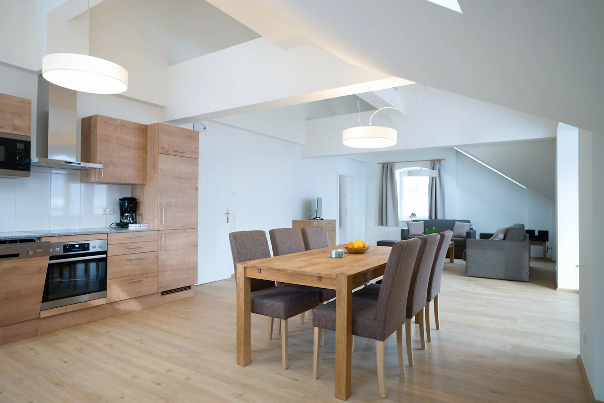 Superior Ferienwohnung. Seeblick, im Zentrum. 2 Schlafzimmer. 1 Badezimmer. 95m². 1 - 8 Personen. Verbringen Sie unvergessliche Tage in Zell am See in unserem Lake view suites Villa Julia - Penthouse Suite und reservieren Sie direkt zum Bestpreis beim Eigentümer.Julias Lake Views – Die Penthouse Suite an der „Water Front“ des Zeller Sees: Auf 95m² paaren sich Luxus und eine grosszügige Raumeinteilung. Zwei Schlafzimmer mit je einem Doppelbett und ein grosser Wohnbereich mit hoher Decke und Holzbalken vermitteln ein gemütliches Raumklima. Insgesamt finden in der Penthouse Suite bis zu 7 Personen Platz. Das Highlight: Der Wohnbereich mit angrenzender Terrasse auf den Zeller See. See- und Bergblick inklusive!Unmittelbar vor der Villa befindet sich die Seepromenade mit der Anlegestelle der MS Schmitten. Weiters grenzt der romantische Altstadtkern von Zell am See an die Rückseite des Hauses. In nur wenigen Schritten sind unsere Gäste im Zentrum von Zell am See mit zahlreichen Shoppingmöglichkeiten, Restaurants und Bars inklusive. Die Gondelbahn City Express (300m) und der Bahnhof (200m) sind auch fussläufig erreichbar. Den Golfplatz (4km) und den Flughafen Salzburg (75km) erreicht man bequem mit dem Auto oder den öffentlichen Verkehrsmitteln.Ob ausgedehnter Brunch oder romantisches Dinner, unsere Küche bietet für jede Gelegenheit die richtige Ausstattung: Kühl/Gefrierschrank, Backofen, Spülmaschine, Geschirr/Besteck, Kochutensilien, Kaffeemaschine, Toaster und Wasserkocher. Zentralheizung und klimatisierter Boden sorgen für die richtige Temperatur zu jeder Jahreszeit. Bügeleisen, Waschmaschine und Trockner sowie ein Parkplatz vor dem Haus komplettieren das Angebot.