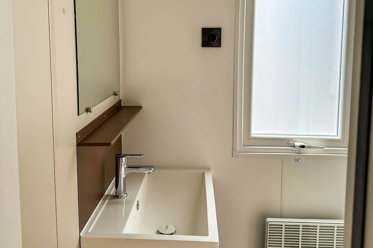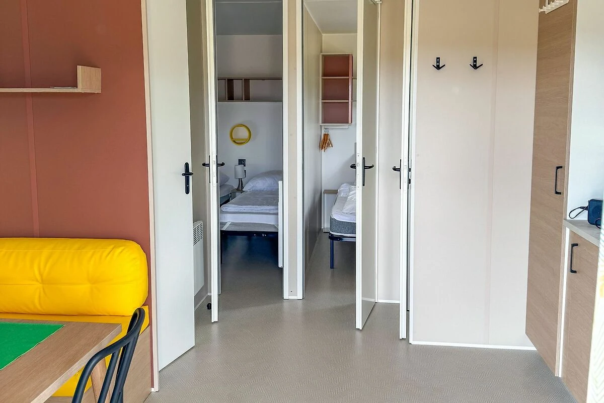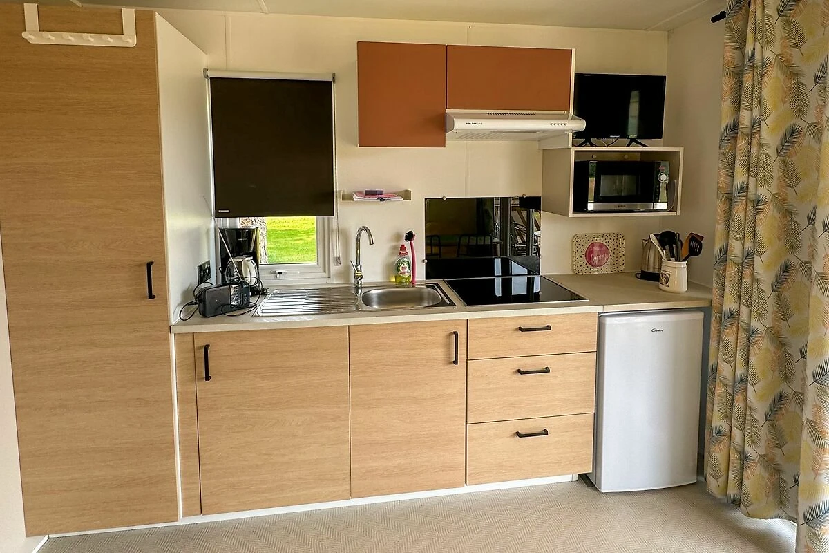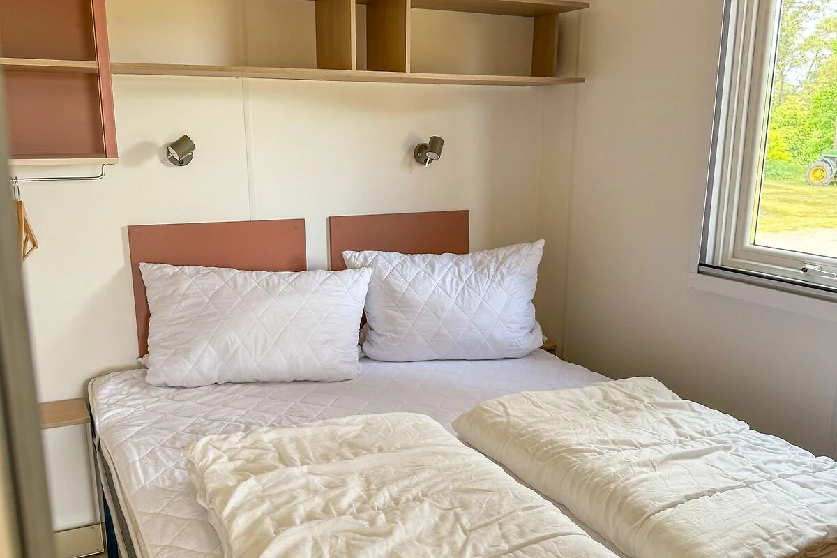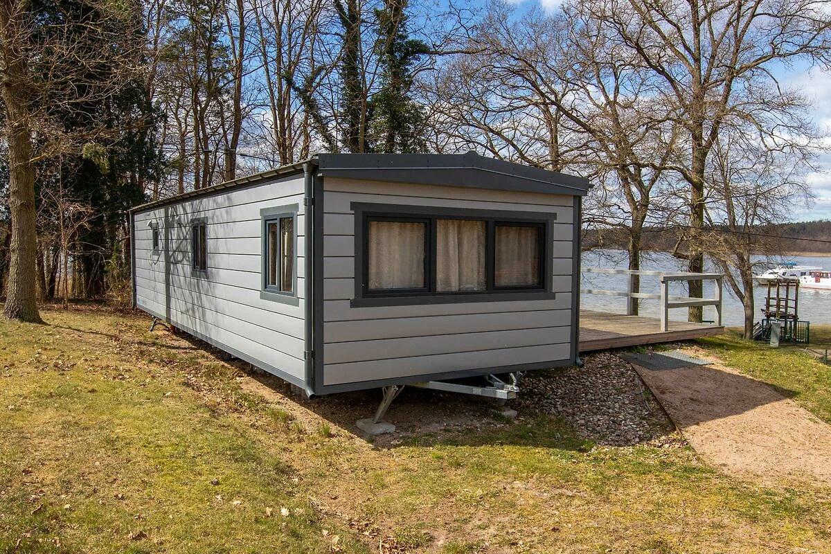 Die komfortabel eingerichteten mobilen Ferienhäuser befinden sich in dem Camping- und Ferienpark in Lychen direkt am Strandbad des Grossen Lychensees. Von den Ferienhäusern haben Sie einen direkten Zugang zum Wasser. Die Mobilheime liegen im Hang, mit einem ruhigen Blick über Felder und Natur. Die Mobilheime sind mit zwei Schlafzimmern, eines mit französischem Doppelbett (160x200) und eines mit zwei Einzelbetten (80x190), einer komplett ausgestatteten Küche, Wohnraum mit TV/Radio und einem Bad mit Dusche und separater Toilette ausgestattet. Sie können den Sonnenuntergang von der integrierten Terrasse geniessen.