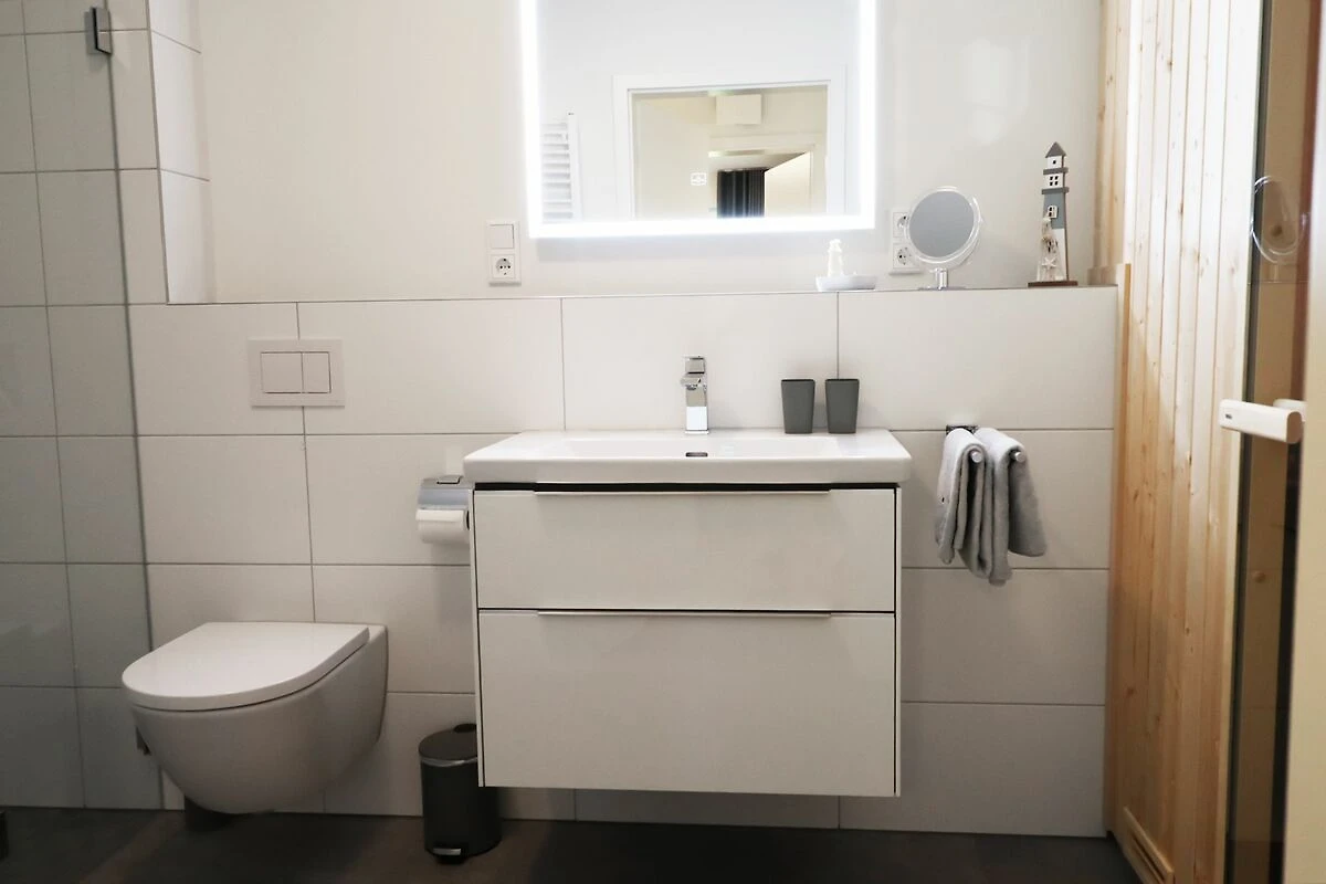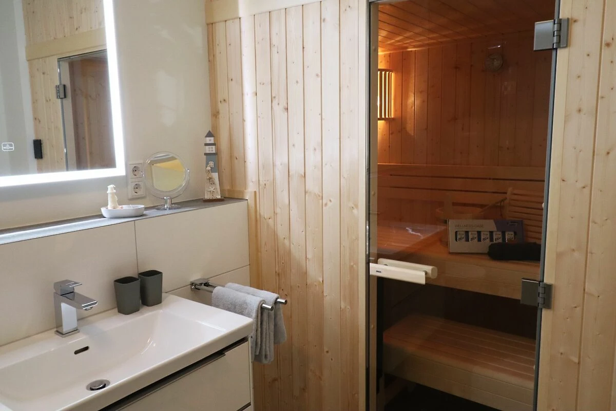 Im modernen Badezimmer erwartet dich dein ganz persönlicher Wellnessbereich: eine bodentiefe Dusche, eine private Sauna, Waschbecken, Spiegel und WC. Dank Fußbodenheizung genießt du auch an kühleren Tagen angenehme Wärme und Erholung.
