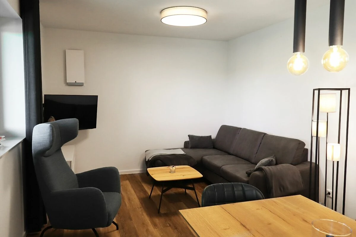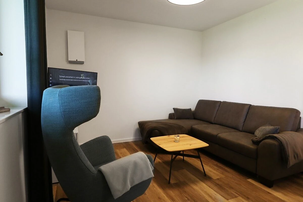 Der offene Wohnbereich ist stilvoll und einladend gestaltet. Mach es dir auf dem großen Sofa mit einem guten Buch oder vor dem Smart-TV gemütlich. Am Esstisch startest du entspannt in den Tag oder verbringst gesellige Abende. Vom Wohnzimmer gelangst du direkt auf die sonnige Terrasse mit Blick ins Grüne – perfekt für erholsame Stunden an der frischen Luft.